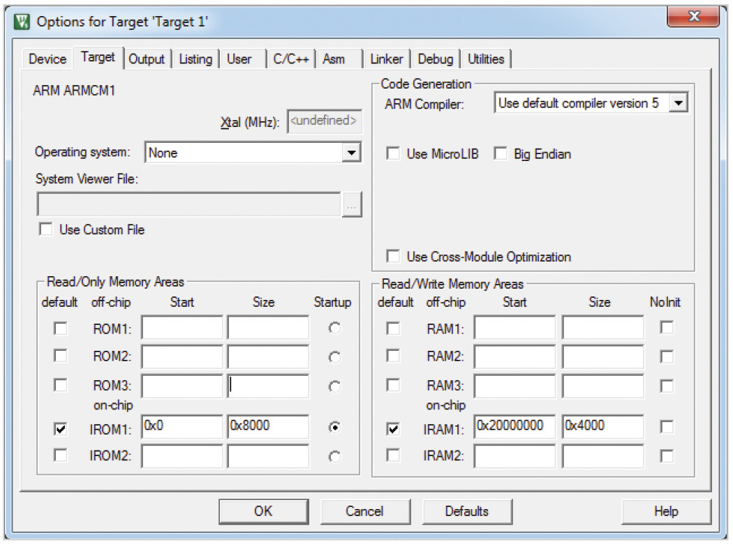 Затем приступаем к настройке проекта, выбрав в главном меню: Project > Options for Target «Target 1». Это окно имеет несколько страниц (вкладок). На странице «Device» должно быть выбрано целевое устройство ARMCM1. Во вкладке задания параметров целевой системы «Target» задаём значения стартовых адресов и размеров различных типов памяти, доступной в целевой системе, как показано на рис. 4. Для процессорного ядра Gowin_EMPU_M1 внутренняя память программ или внешняя память программ является памятью ROM (IROM1 на рис. 4), а внутренняя память данных или внешняя память данных является памятью RAM (IRAM1 на рис. 4).
