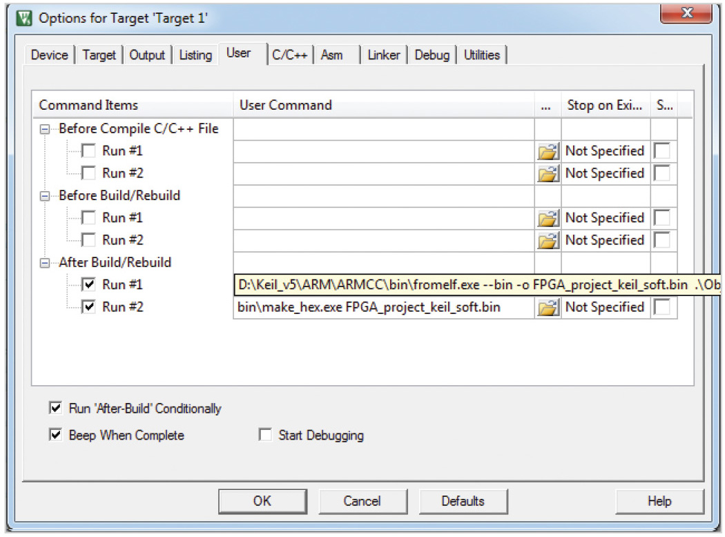 В нашем проекте вместо формальных имен bin-file и axf-file указываем реальные имена наших файлов (FPGA_project_keil_soft.bin и FPGA_project_keil_soft.axf), также указываем реальные пути к утилитам fromelf.exe и make_hex.exe на диске ПК. У автора эти команды имеют следующий вид: