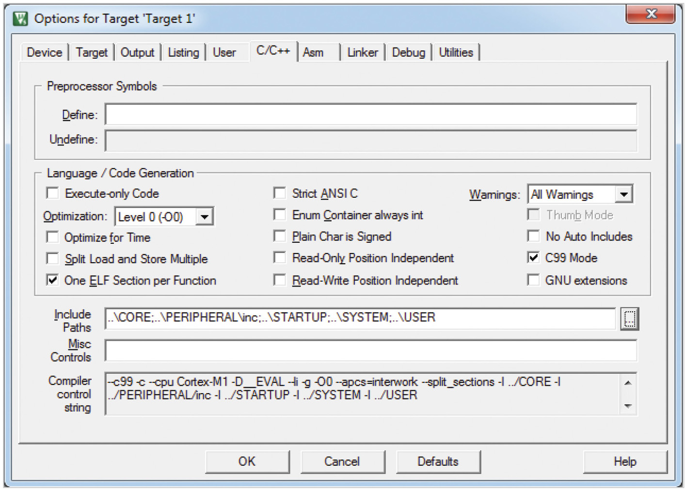 Настраиваем параметры компиляции нашего проекта. На странице «C/C++» окна настройки проекта устанавливаем настройки, как показано на рис. 6.