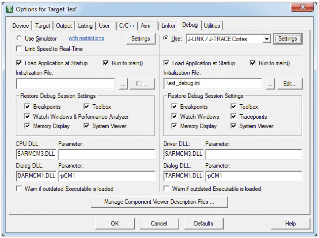 На странице «Debug» окна настройки проекта устанавливаем настройки, как показано на рис. 8. В частности, указываем тип аппаратного отладчика-программатора, который в дальнейшем будем использовать для отладки кода в нашем программном процессорном IP-ядре, например, J-LINK/J-TRACE Cortex.
