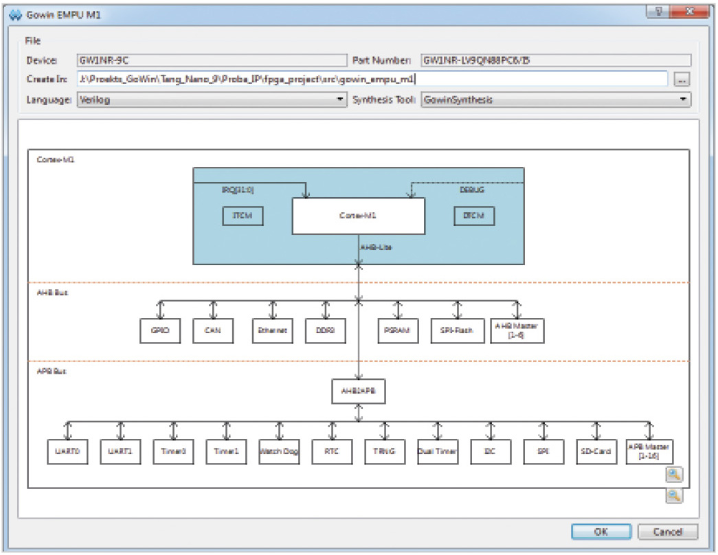 В верхней части окна указаны заданные по умолчанию имя нашего процессорного IP-ядра с периферией (gowin_empu_m1), путь к нему и язык синтеза ядра – Verilog. Оставляем эти настройки без изменения.