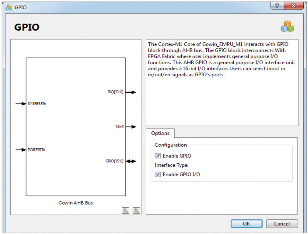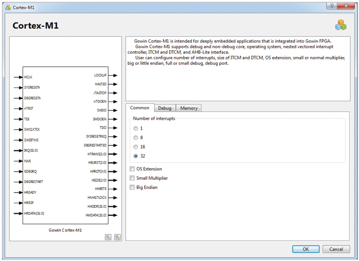 - Процессорное ядро должно иметь архитектуру ARM Cortex-M1, которой в IDE GOWIN FPGA Designer соответствует обозначение Gowin_EMPU_M1.