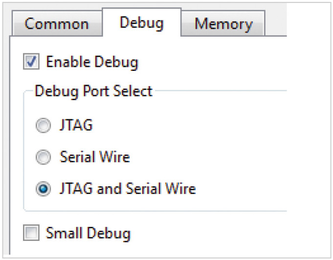 На странице «Debug» оставляем все настройки заданными по умолчанию, как показано на рис. 13, таким образом, разрешаем поддержку отладки ПО процессорного IP-ядра через интерфейсы JTAG и SW.