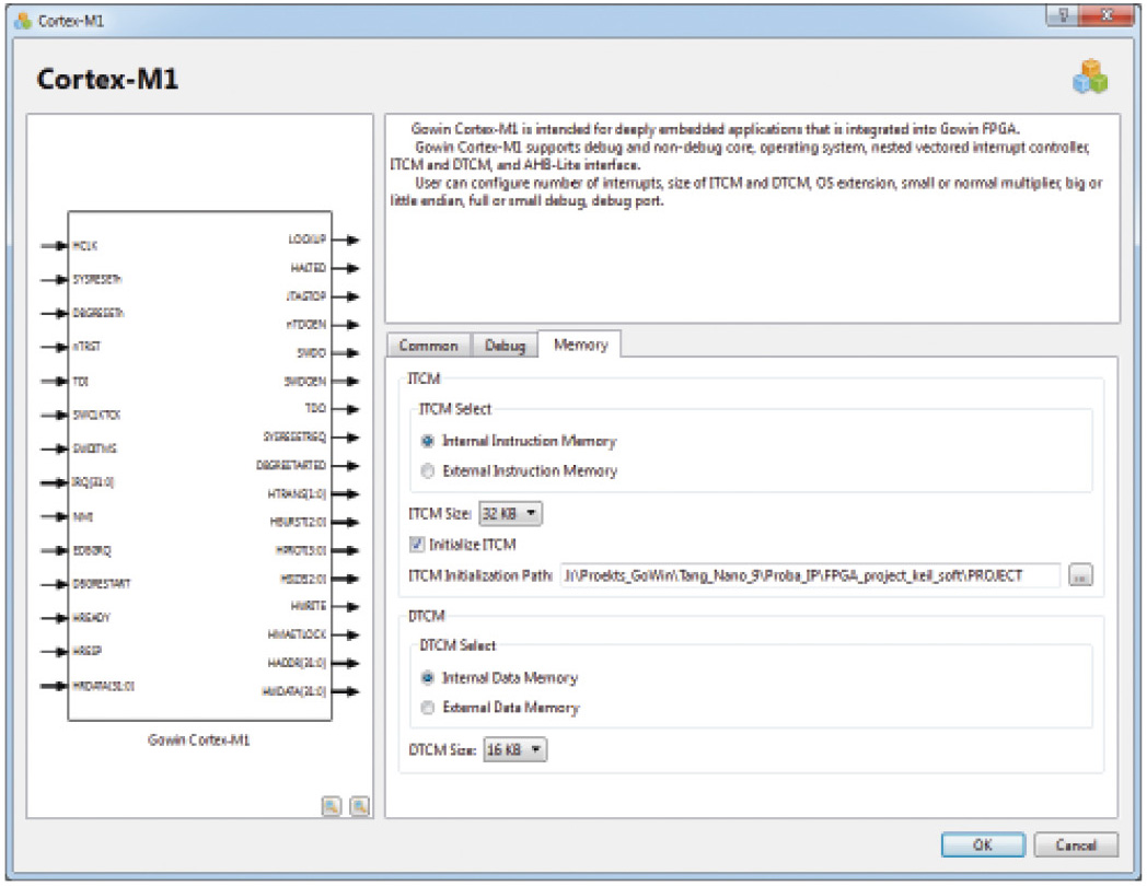 путь к каталогу PROJECT с файлами itcm0–itcm3, ранее сгенерированными нами в проекте FPGA_project_keil_soft. При синтезе IP-ядра эти файлы автоматически включаются в него. Необходимо заметить, что при внесении каких-либо изменений во встроенное ПО IP-ядра в IDE ARM Keil MDK и соответственно новой генерации файлов itcm0–itcm3 придётся заново синтезировать в IDE GOWIN FPGA Designer всё процессорное IP-ядро с его периферией. Затем потребуется заново пересобрать весь проект ПЛИС с новым процессорным IP-ядром.