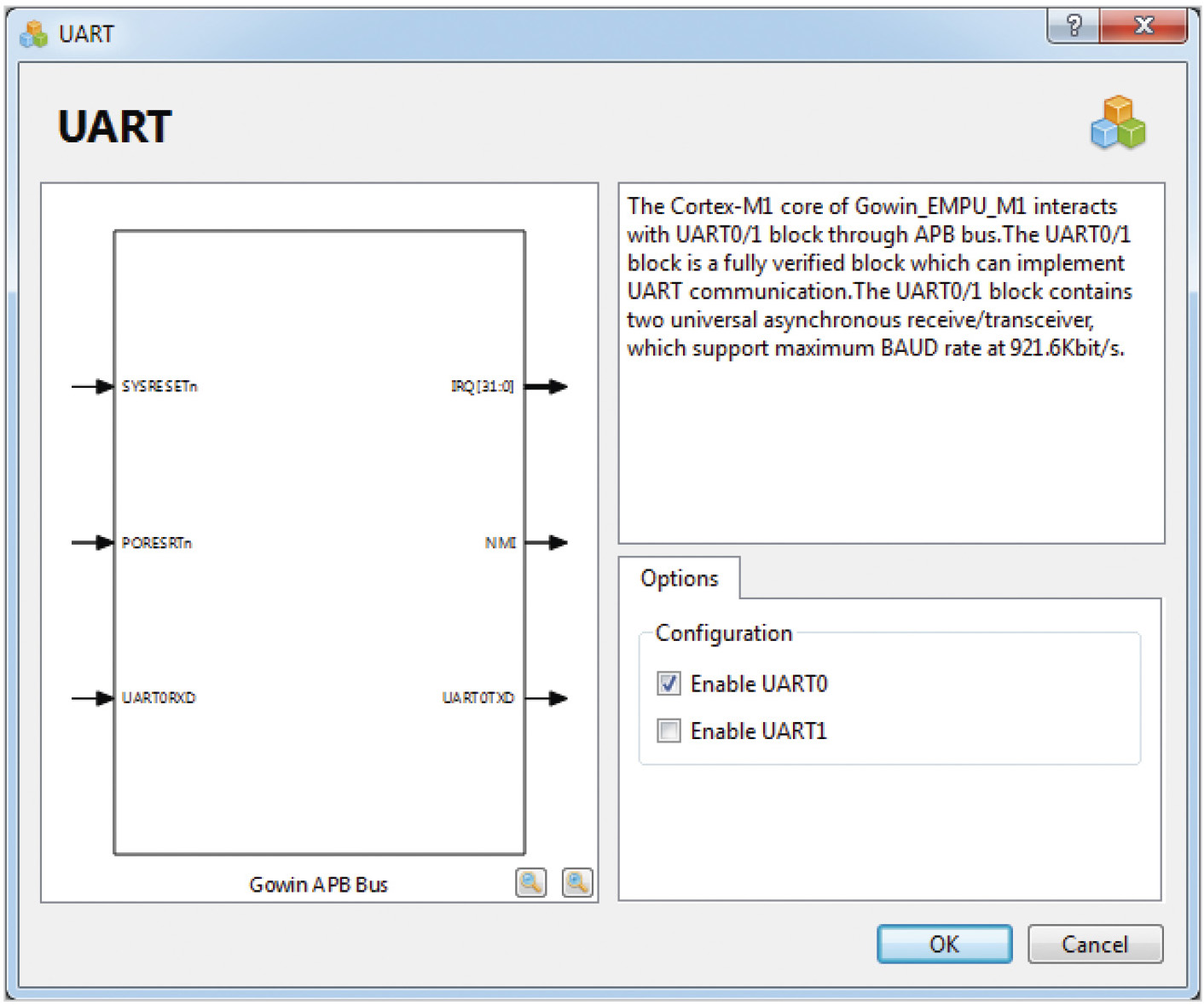 В окне со схемой (рис. 11) наводим курсор на прямоугольник с надписью UART и дважды кликаем на нём. Открывается окно задания параметров модуля UART, показанное на рис. 16. В этом окне ставим галочки в позиции «Enable UART0», тем самым разрешая IP-ядру поддержку одного из двух имеющихся модулей UART – UART0. Кликаем на кнопке «OK». Модуль UART настроен.