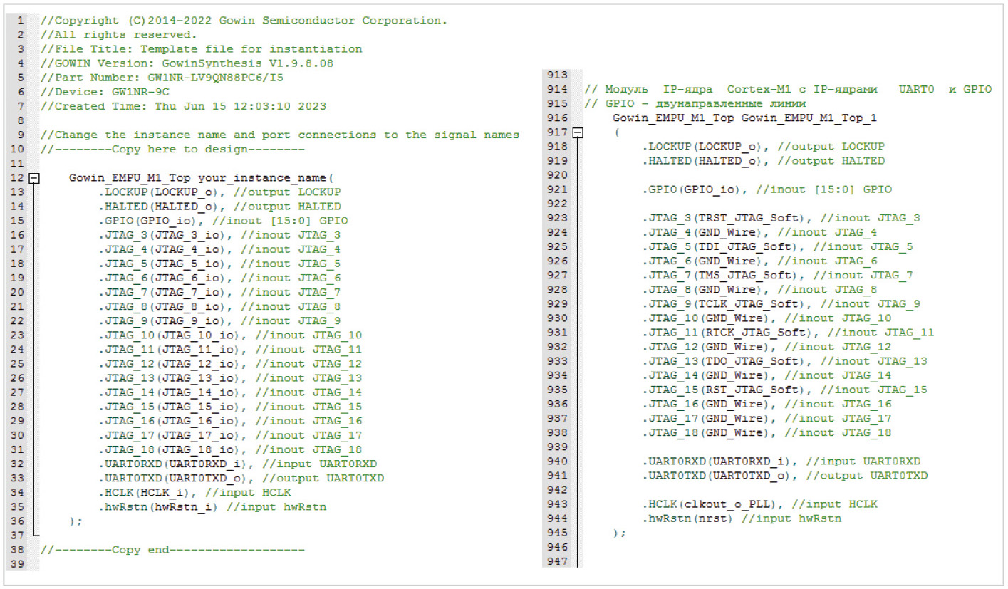 - файл синтезированного IP-ядра с периферией на языке Verilog HDL gowin_empu_m1.v. Заметим, что исходный код в нём недоступен для просмотра и копирования (зашифрован);