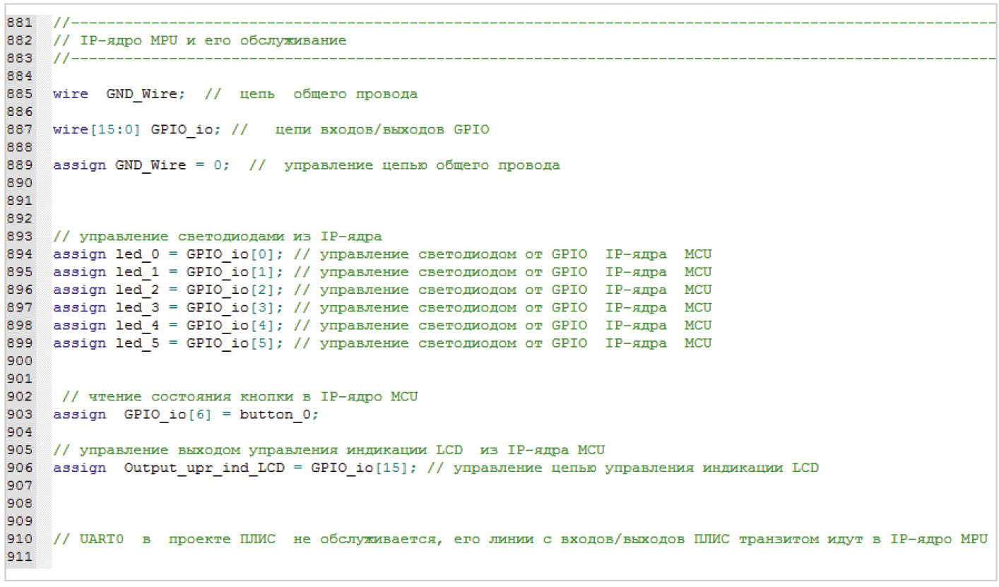 - процессорное IP-ядро Gowin_EMPU_M1 со своей периферией, осуществляющее обмен через UART с внешними устройствами, управляющее шестью выходами GPIO, к которым на плате TangNano 9K подключены светодиоды, опрашивающее один вход GPIO, к которому на плате TangNano 9K подключена кнопка, а также управляющее ещё одним выходом GPIO (Output_upr_ind_LCD – выв. 86 ПЛИС на плате TangNano 9K).