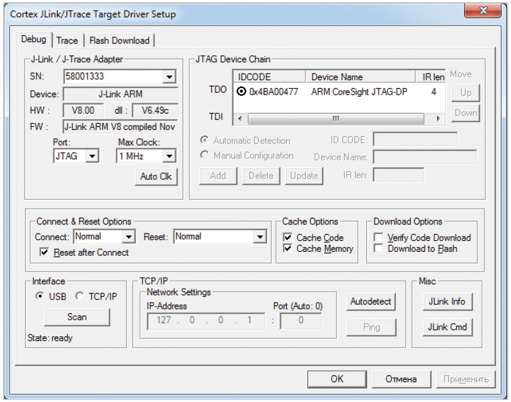 Для проверки работы отладчика откроем наш проект FPGA_project_keil_soft в IDE ARM Keil MDK, выберем в главном меню: Project > Options for Target ‘Target 1 и перейдём на страницу «Debug» (рис. 8). Далее кликнем на кнопке «Settings», после чего откроется окно настроек аппаратного отладчика J-LINK/J-TRACE Cortex, показанное на рис. 20.