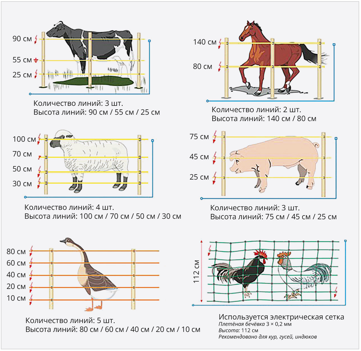 Ещё лучшим решением считаются фарфоровые изоляторы как наименее подверженные влаге и повреждениям. При креплении проводов на опоры стоит учесть размер животного, для которого создан загон, в соответствии со следующими рекомендациями: