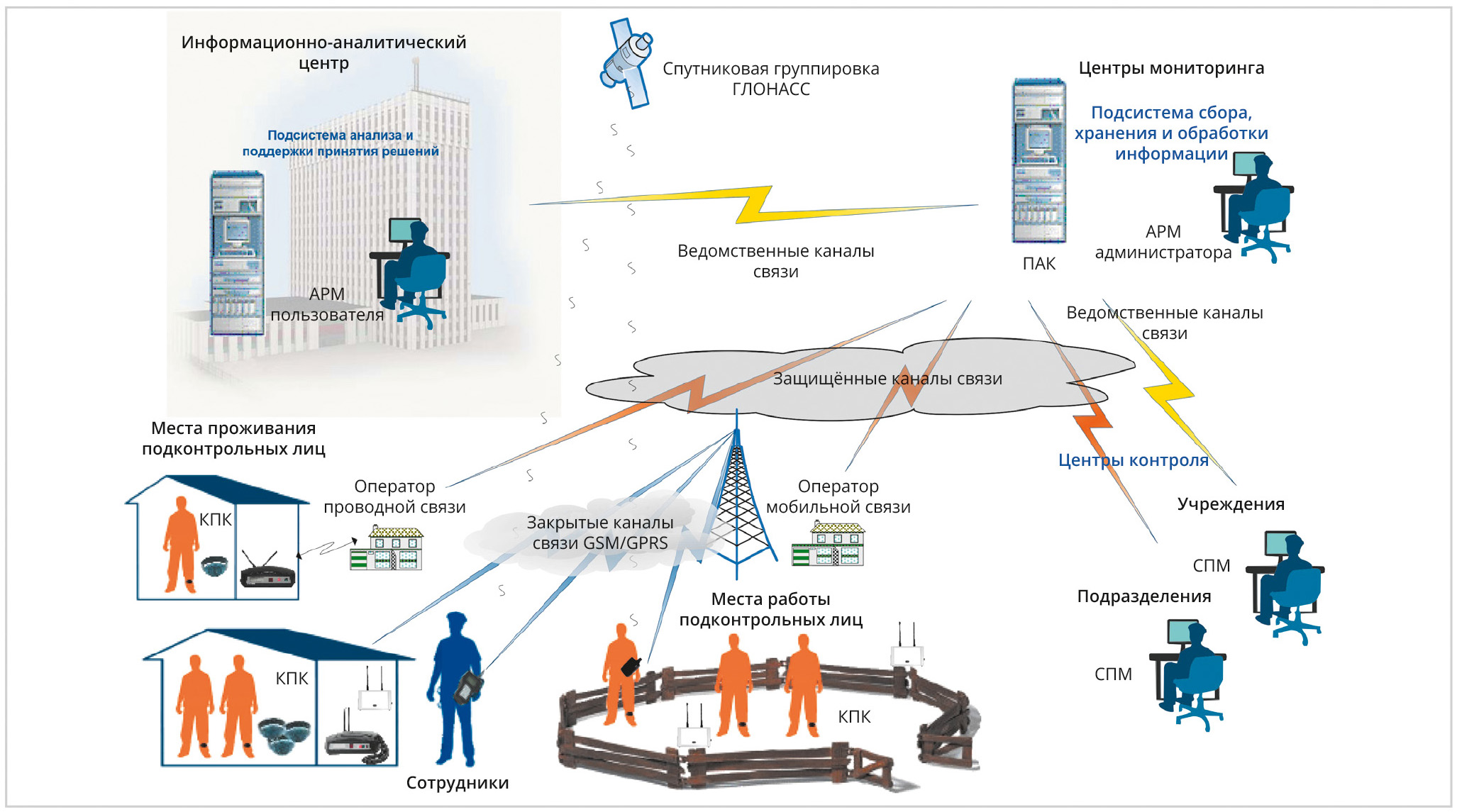 СЭМПЛ активно и уже много лет применяют в Израиле, США, Великобритании, Финляндии, Испании и многих других странах. В России при фактически многолетнем наличии уголовно-исполнительных инспекций (УИИ) в исправительной системе под управлением Федеральной службы исполнения наказаний (ФСИН РФ) СЭМПЛ начали применять относительно недавно: примерно 13 лет назад. Эта возможность открылась по нескольким причинам. Во-первых, была проблема перенасыщения тюрем, и осуждённых по статьям небольшой тяжести или на заключительных сроках отбывания наказаний старались переводить на более мягкий режим. Во-вторых, среди отбывающих наказание всегда были разные категории осуждённых. Сложно поставить рядом уголовника-рецидивиста и мать пятерых несовершеннолетних детей, совершившую преступление по неосторожности. Поэтому возникла необходимость дифференцировать в части условий реализации наказания и следственной изоляции разные категории осуждённых и подозреваемых. В-третьих, с развитием устойчивой беспроводной связи появилась возможность технического осуществления дистанционного контроля за местонахождением и даже занятиями осуждённых к ограничению свободы подконтрольных лиц, в том числе при избранной мере пресечения «домашний арест». Все эти факторы так или иначе взаимосвязаны между собой. В результате было усовершенствовано и правовое поле: в поправках к Уголовно-исполнительному кодексу с 1 января 2010 года регламентировали такие понятия, как «домашний арест» для гражданских лиц и сопутствующие правовые нормы [2, 10]. На рис. 1 представлена схема элементов в СЭПМЛ.
