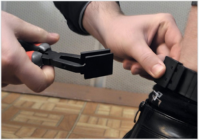 Ремешок сделан из силикона с регулировкой длины и системой защиты от перерезывания: в силиконовый состав вживлены стальные нити. Так же, как в ХХ веке для укрепления стекол во внутренних дверях жилых домов и общественных зданий вставлялись скреплённые между собой проволочные нити в виде сетки – так называемые армированные стёкла. При ударе стекло деформировалось (вдавливалось), но не рассыпалось. Что касается ремешков браслетов СЭМПЛ, в каждом идут 3–4 продольные стальные нити, перекусить которые можно только с помощью специального инструмента – бокореза. Это действие представлено на рис. 10.