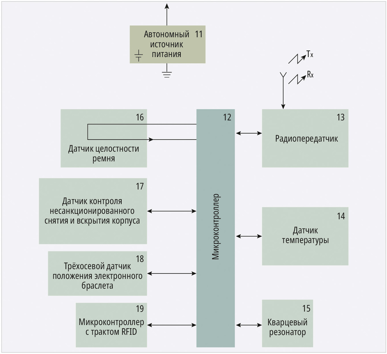 Браслет состоит из замка, датчика температуры и радиомодуля приёмопередатчика. Датчик температуры нужен для того, чтобы дополнительно следить за контактом с телом человека, и является элементом контроля против снятия браслета, управляющегося с помощью микроконтроллера и питающегося от аккумулятора. Это характерно для всех типов электронных браслетов, модернизация которых часто происходит за счёт улучшения защиты корпуса и застёжки от взлома. Может показаться странным, что при разработке такого «умного» устройства слежения основное внимание уделяется противодействию примитивному способу взлома. Однако это оправдано тем, что при несанкционированном снятии браслета невозможно точно установить местоположение конкретного человека. В этой связи уместно рассматривать методику определения мест для размещения элементов системы электронного мониторинга подконтрольных лиц на базе радиосети передачи данных с применением геоинформационных технологий [3, 12].