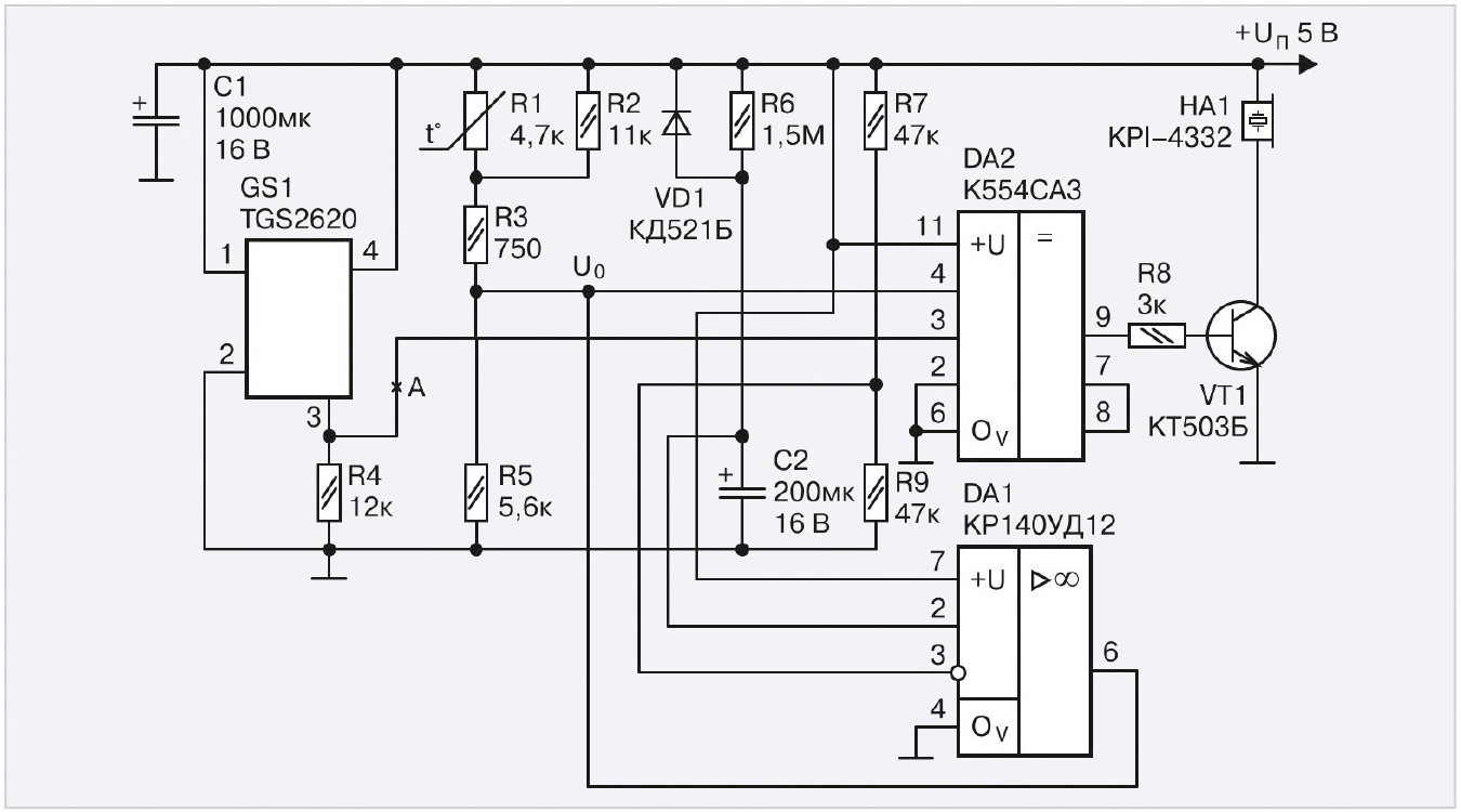 В тот момент, когда напряжение (под воздействием паров алкоголя с концентрацией, равной или превышающей установленный предел) в точке А превысит заданную элементами внешней RC-обвески величину напряжения на входе U¬0, выходной сигнал с компаратора DA1 (его высокий уровень) обеспечит включение звукового капсюля со встроенным генератором НА1 (или иное устройство звуковой/световой сигнализации, подключённое с соблюдением полярности вместо капсюля НА1). Напряжение U0 может меняться в диапазоне 2,5–3,2 В при температуре окружающего воздуха +40°С и относительной влажности 65% и, соответственно, в диапазоне 1,9–3,1 В при температуре –10°С. Без термокомпенсирующей схемы график отклика мог бы изменяться в диапазоне 600–3400 ppm при заданном значении концентрации газа 1500 ppm (при окружающей температуре +20°С и влажности 65%). Для термокомпенсации служит термистор R1.