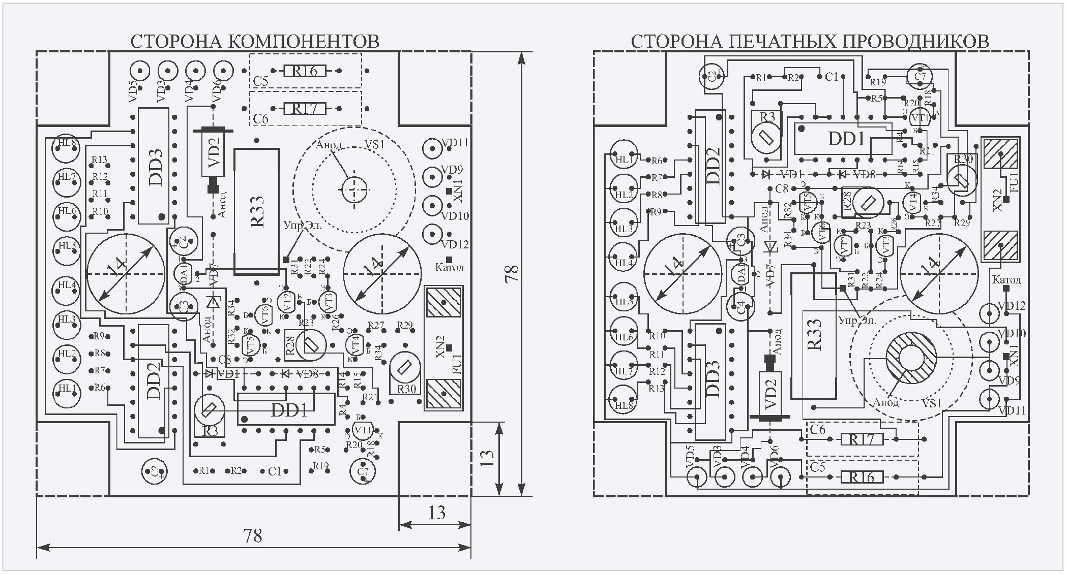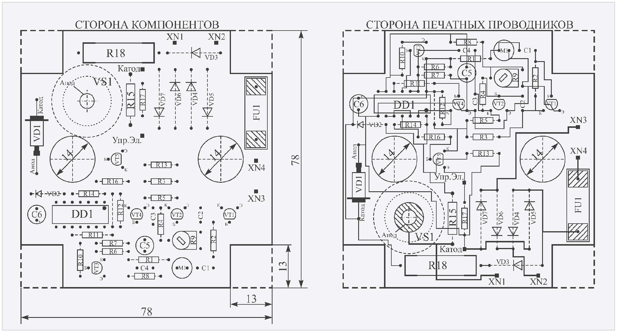 Конструкция и детали. Данный автомат собран на печатной плате (рис. 5) из двустороннего стеклотекстолита толщиной 1,5 мм из квадратной заготовки размерами 78×78 мм. Для установки в стандартную сетевую разветвительную коробку типа КЭМ5-10-7 в квадратной заготовке вырезаются уголки размерами 13×13 мм. В автомате применены постоянные резисторы МЛТ-0,125, МЛТ-2 (R33), подстроечные СП3-38б в горизонтальном исполнении, балластные конденсаторы С5, С6 типа К73-17 с номинальным напряжением 400 В, остальные неполярные – К10-17, электролитические – К50-35. На месте стабилитронов VD2, VD7, как и в предыдущем варианте, могут работать Д814В (а также с индексами «Г», «Д»), КС510, КС512, КС515 или аналогичные импортные маломощные BZX55C10, BZX55C12, BZX55C15 с напряжением стабилизации 10…15 В. Транзисторы VT1, VT2, VT6 могут быть из серии КТ3102 с любыми индексами или импортные BC547; VT3…VT5 – КТ3107 или импортные BC557. ИМС DD1 КР1564ТЛ2 (74HC14N), содержащая шесть триггеров Шмитта, заменима CD40106, счётчик КР1561ИЕ20 (CD4040BN) заменим КР1564ИЕ20 (74HC4040N).