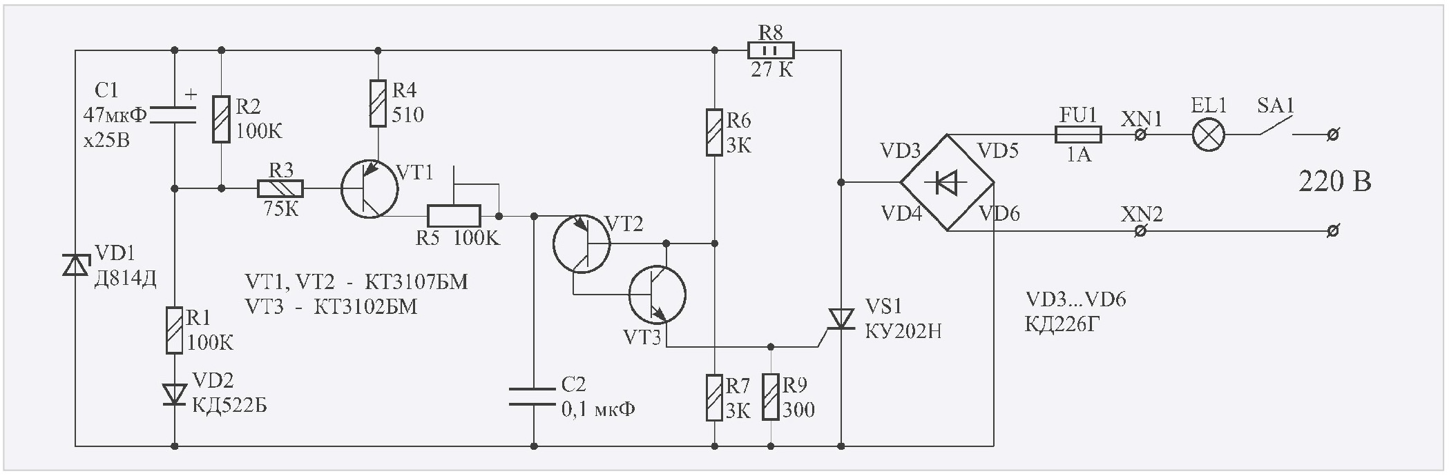 В качестве базового схемотехнического решения второго варианта автомата лестничного освещения (рис. 4) используется тиристорный регулятор яркости [2] с некоторыми изменениями (рис. 3).
