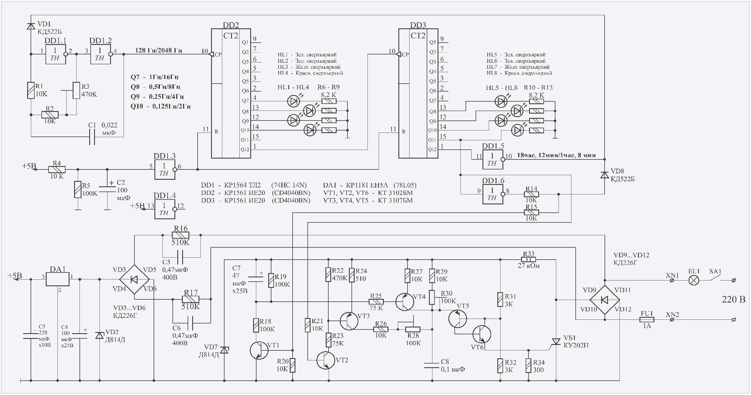 В момент замыкания цепи питания (SA1) падение напряжения на лампе накаливания максимально, и, так как в состав параметрического стабилизатора введены балластные конденсаторы C5, C6 относительно небольшой ёмкости, зарядка конденсатора C4 происходит не сразу, а в течение десятых долей секунды. По этой причине постоянная времени интегрирующей цепи R4–C2 выбрана несколько больше времени установления питающего напряжения «+5 В» на выходе интегрального стабилизатора DA1 для обеспечения надёжного обнуления счётчиков DD2 и DD3 в момент включения питания. После установления питающего напряжения «+5 В» на входе инвертирующего элемента DD1.3 с триггером Шмитта ещё некоторое время (определяется номиналами R4, C2) поддерживается уровень лог. 0, который после инвертирования этим элементом обнуляет счётчики DD2 и DD3.