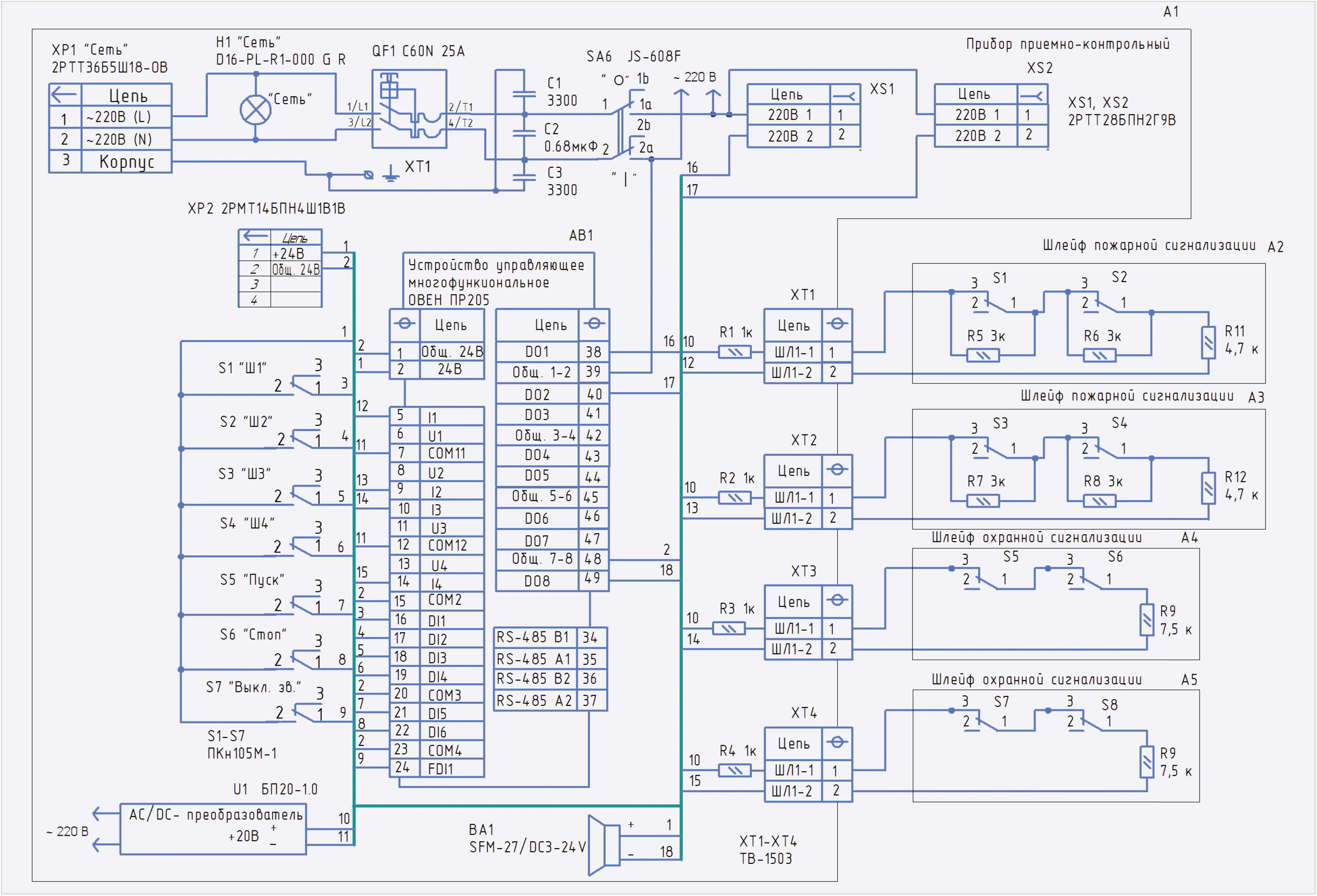 В состав ППК входят: ПР205 АВ1; кнопки управления S1–S7; лампа H1; модуль питания U1; звуковой пьезоизлучатель ВА1; клеммные колодки ХТ1–ХТ4. К соединителям XS1 и XS2 подключаются соответственно пожарные и охранные оповещатели. Сетевое напряжение 220 В поступает на соединитель ХР1. Напряжение 24 В поступает на соединитель ХР2.