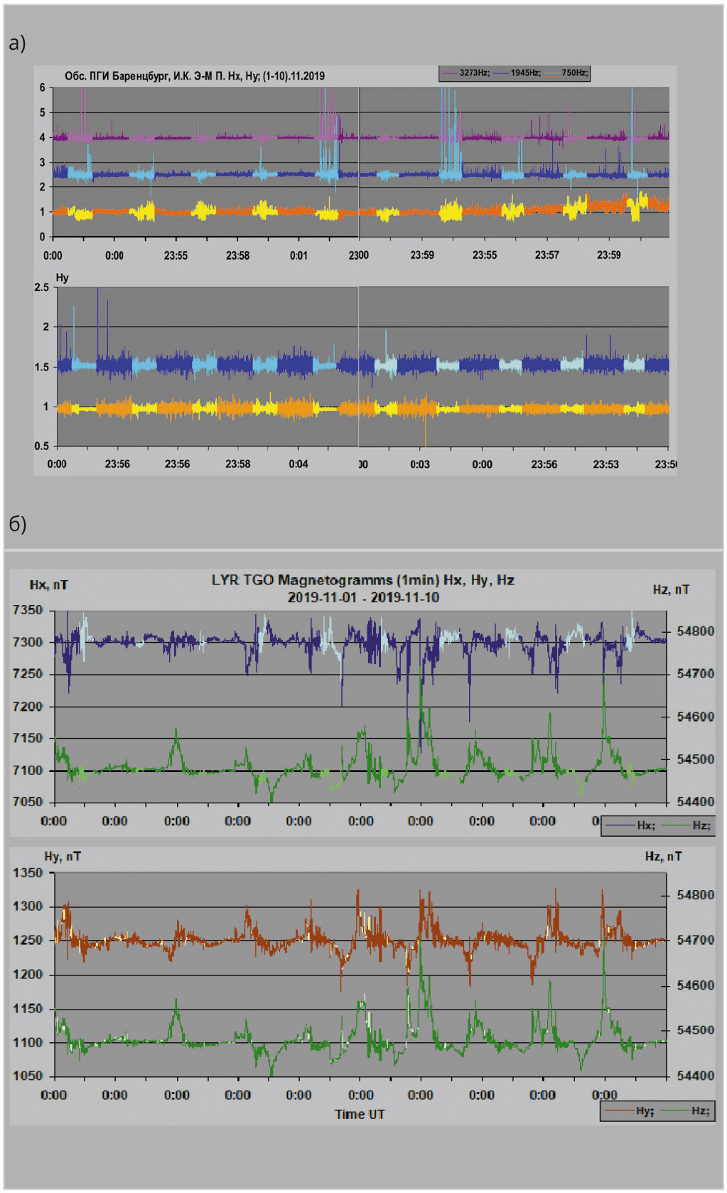 ![Рис. 1. Синхронная запись АЧХ И.К. Э-М. П. и магнитного поля Земли, период записи [01.11.2019–10.11.2019]: а) АЧХ И.К. Э-М. П. [Hx, Hy]; б) магнитограммы [Hx, Hy, Hz] поля Земли](/images_soel/publications/2025/2025-7/SE2025-7_39-01.jpg)
