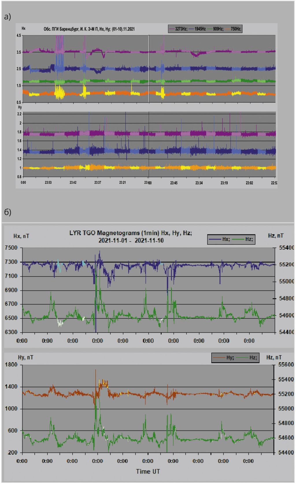 ![Рис. 2. Синхронная запись АЧХ И.К. Э-М. П. и магнитного поля Земли, период записи [01.11.2021–10.11.2021]: а) АЧХ И.К. Э-М. П. [Hx, Hy]; б) магнитограммы [Hx, Hy, Hz] поля Земли](/images_soel/publications/2025/2025-7/SE2025-7_39-02.jpg)