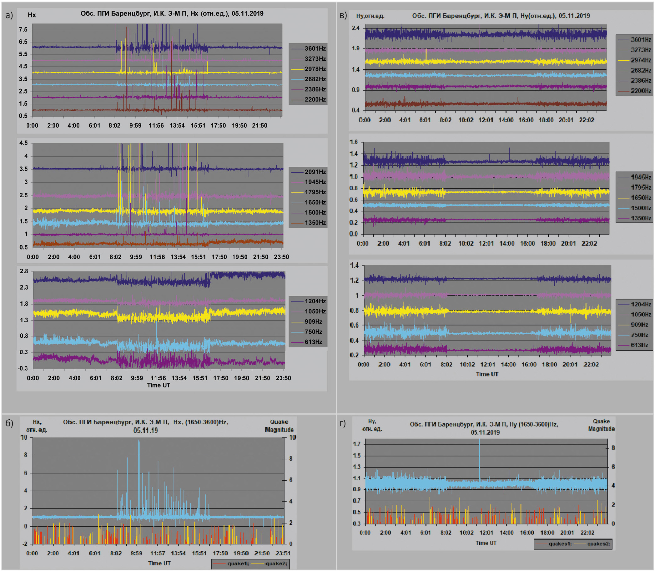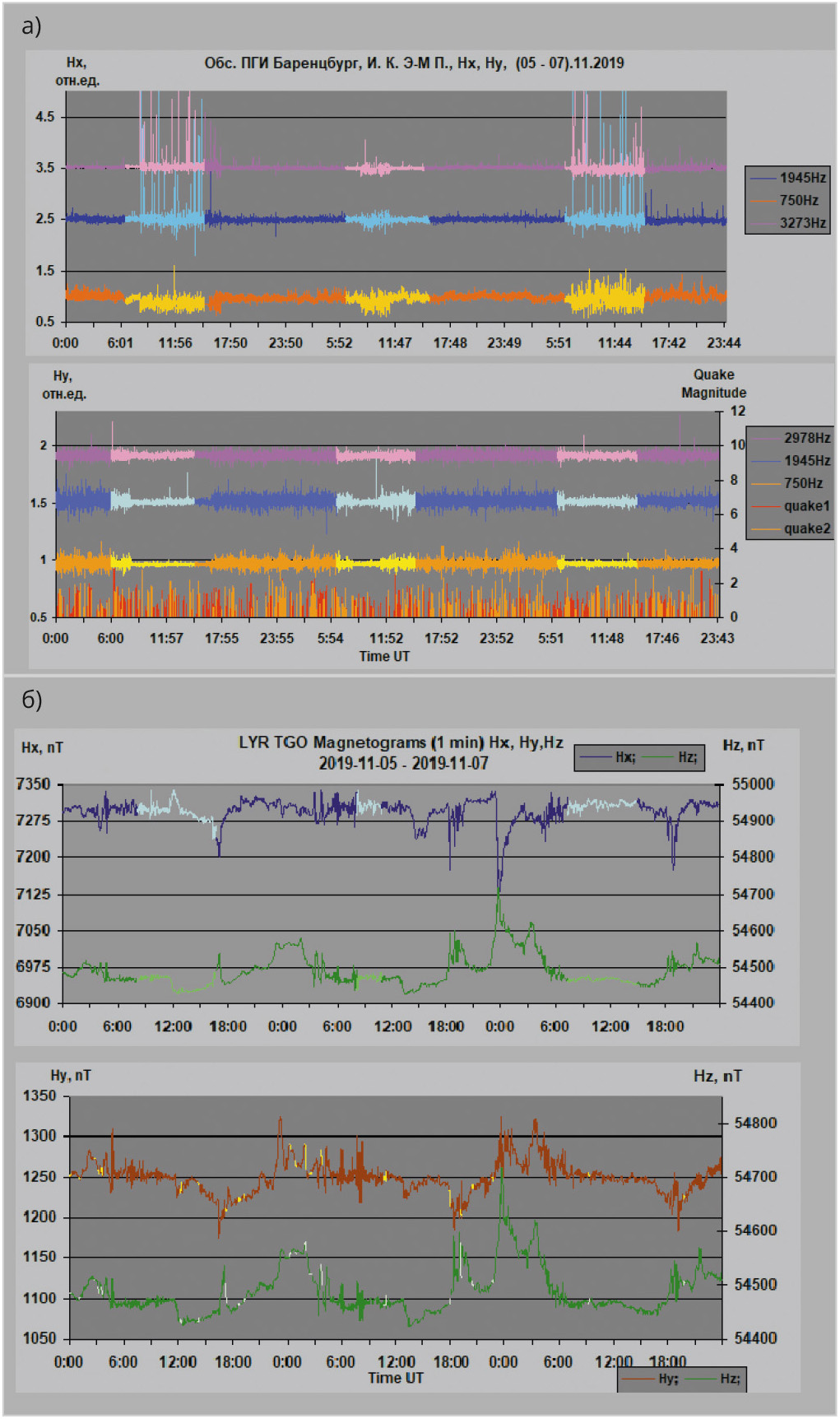 ![Рис. 3. Синхронная запись АЧХ И.К. Э-М. П., сейсмической активности и магнитного поля Земли, период записи [05.11.2019–07.11.2019]: а) АЧХ И.К. Э-М. П. [Hx, Hy] и сейсмическая активность (quake 1, quake 2); б) магнитограммы поля Земли [Hx, Hy, Hz]](/images_soel/publications/2025/2025-7/SE2025-7_39-03.jpg)