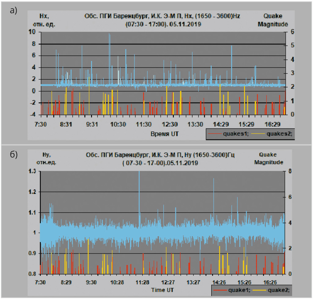 ![Рис. 5. Синхронная запись АВХ пьезоэлектромагнитного импульса П-Э-М.И. и сейсмической активности, период записи [(07:30–17:00) 05.11.2019]: а) синхронная запись АВХ П-Э-М.И. [Hx] и сейсмической активности (quakes 1, 2); б) синхронная запись АВХ П-Э-М.И. [Hy] и сейсмической активности (quakes 1, 2)](/images_soel/publications/2025/2025-7/SE2025-7_39-05.jpg)