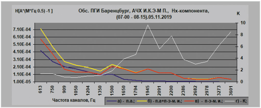 ![Рис. 6. АЧХ импульсной компоненты электромагнитного поля [Hx], ΔF = 613…3600 Гц, период записи [(07:00–08:15) 05.11.2019]: а) поле атмосфериков; б) суперпозиция поля атмосфериков и пьезоэлектромагнитного импульса; в) пьезоэлектромагнитный импульс; г) К = П-Э-М.М./П.А.](/images_soel/publications/2025/2025-7/SE2025-7_39-06.jpg)