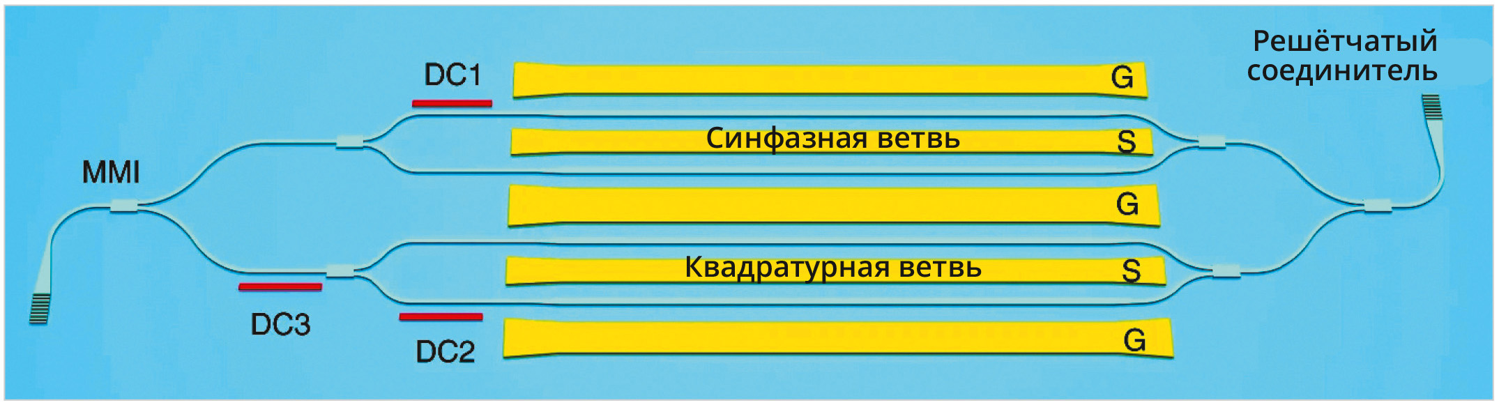 Выходной MMI-сумматор складывает ветви и формирует модулированный по фазе, амплитуде и поляризации окончательный сигнал.