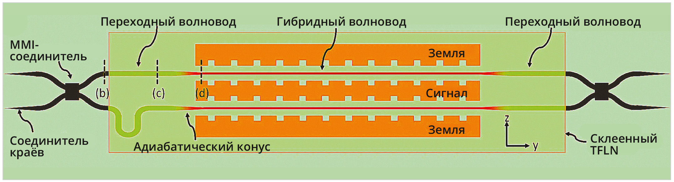 Особое внимание следует обратить на форму полосковых проводников Ground/Signal, выполненных в форме «гребёнки». Основная цель такой конструкции заключается в согласовании скоростей прохождения света в гибридном волноводе и модулирующего СВЧ-сигнала [20].