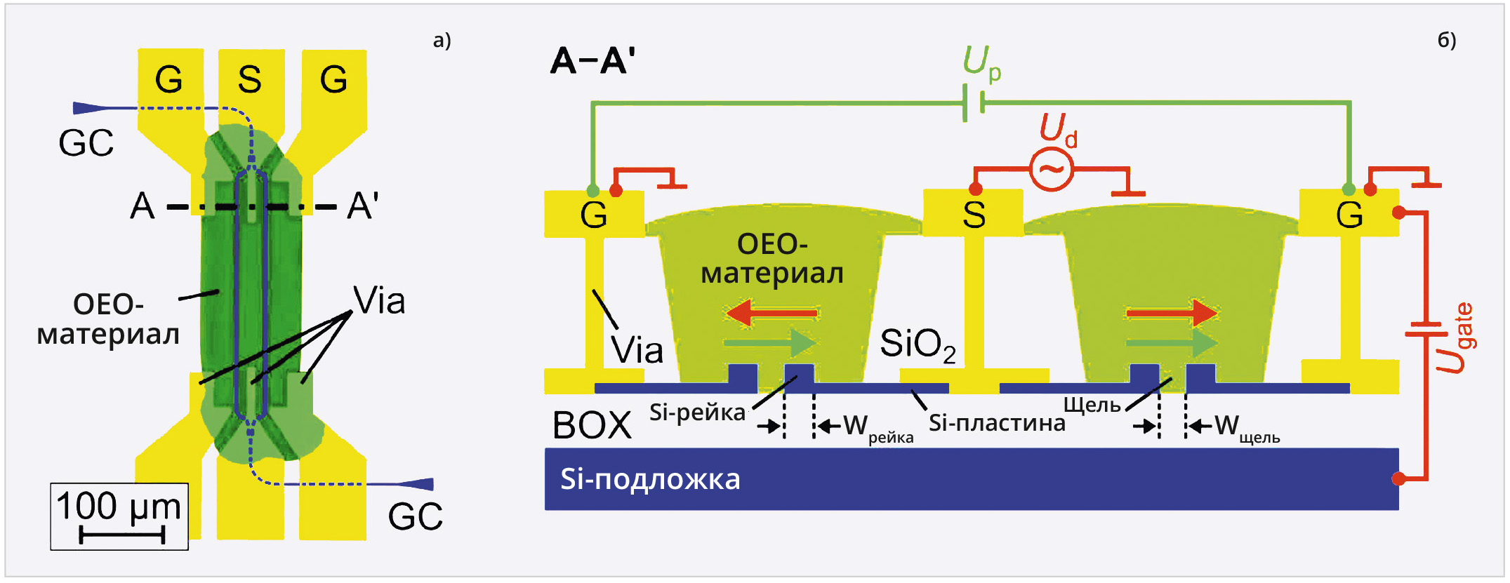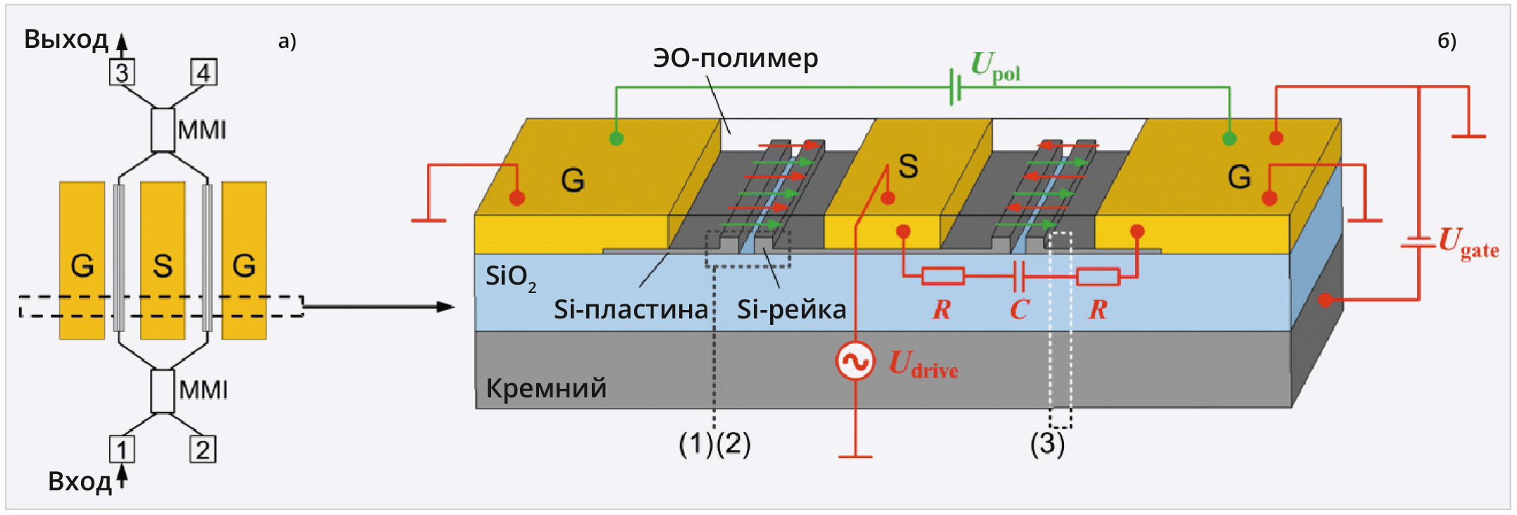 Общая концепция структурной схемы модулятора осталось такой же, как показано на рис. 8. Изменения в основном коснулись размеров и конфигурации некоторых элементов. Например, в новом варианте SOHFS MZM был использован сверхминиатюрный фазосдвигающий элемент длиной всего 280 мкм. В каждом плече имеются две кремниевые рельсовидные рейки шириной Wrail ≈ 240 нм и высотой Hrail ≈ 220 нм, которые образуют оптический щелевой волновод (ширина щели Wslot ≈ 130 нм), заполненный OEOM-материалом.
