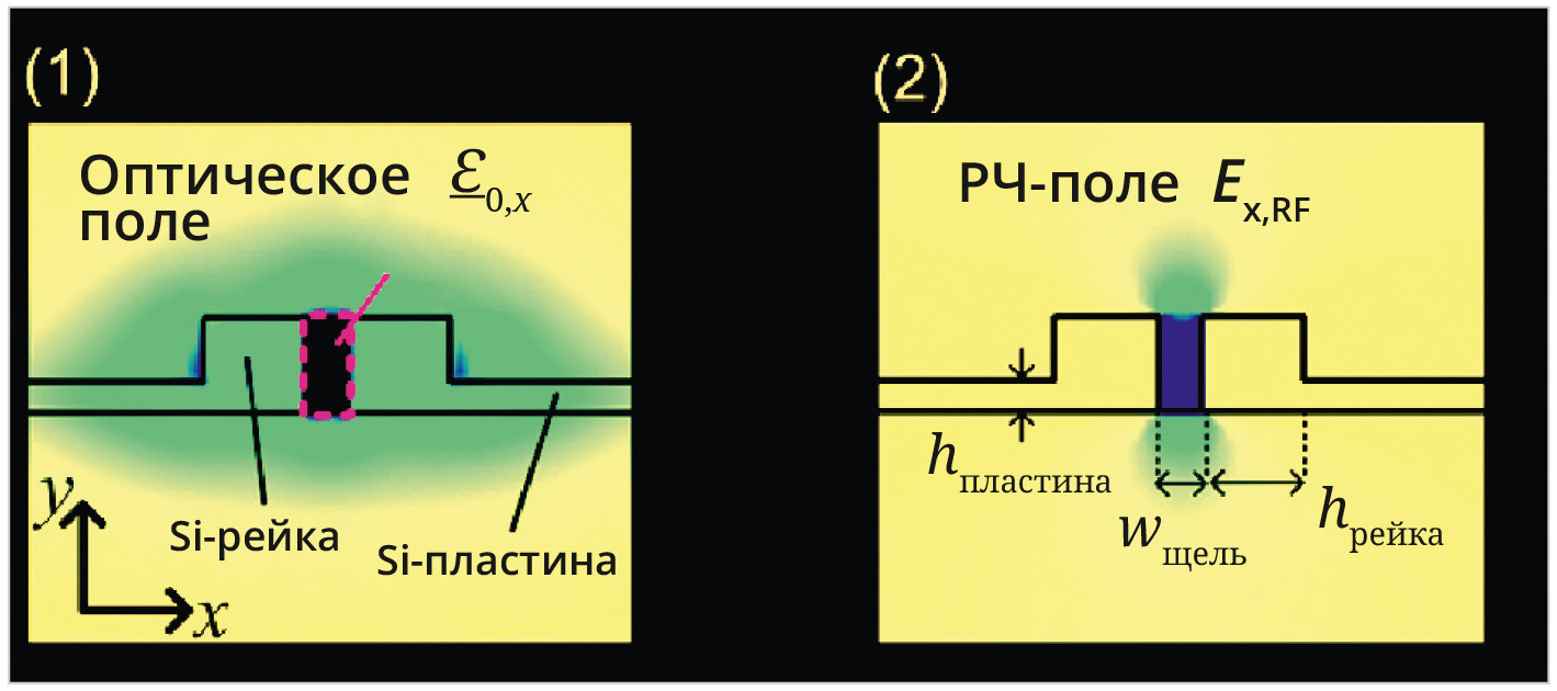 Как видно из левой части рис. 11, на начальном пути луча в волноводе в пространстве щели Aslot доминирует продольная составляющая электромагнитного поля светового сигнала (εo,x). Правая часть рис. 11 демонстрирует, как по мере продвижения луча по волноводу продольная составляющая внешнего поля Ex,rf начинает эффективно взаимодействовать с полем оптического сигнала εo,x, реализуя необходимую модуляцию.