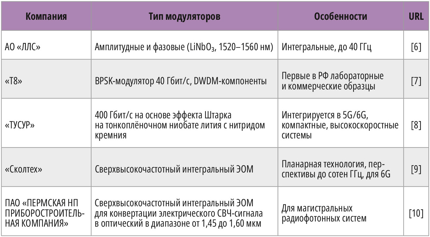 В табл. 1 приведён список пяти наиболее заметных российских производителей электрооптических модуляторов.