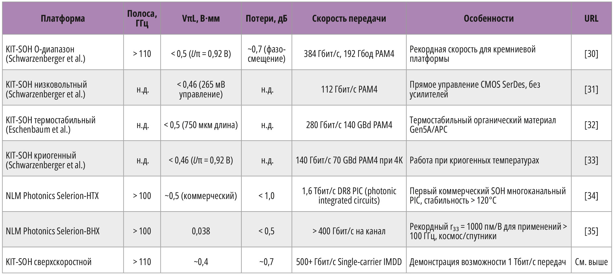 - кремнийорганические SOH-модуляторы открывают принципиально новые возможности благодаря сверхвысоким электрооптическим коэффициентам органических материалов (до 1000 пм/В) и совместимости с CMOS-технологиями.