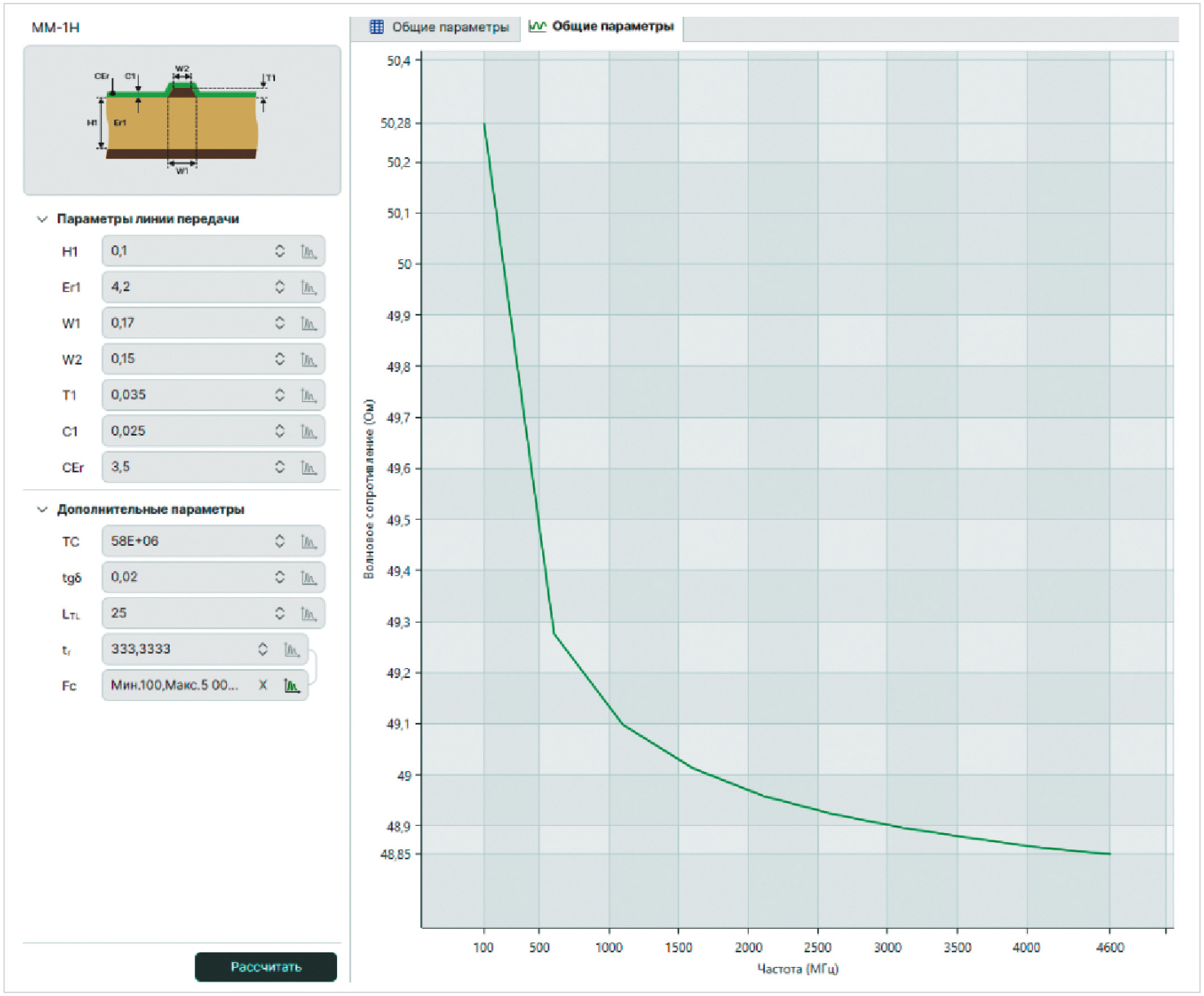 Значительная часть инженеров при расчёте параметров линий передачи часто ограничиваются расчётом без потерь. Это оправдано, когда стоит задача оценить только волновое сопротивление или задержку, так как известно, что при вычислении импеданса в широком диапазоне частот его разброс не превышает 5%. Такая погрешность вполне удовлетворяет требованиям большого количества интерфейсов передачи данных. На рис. 1 показан пример зависимости волнового сопротивления одиночной линии передачи от частоты, полученной в программе SimPCB Lite.
