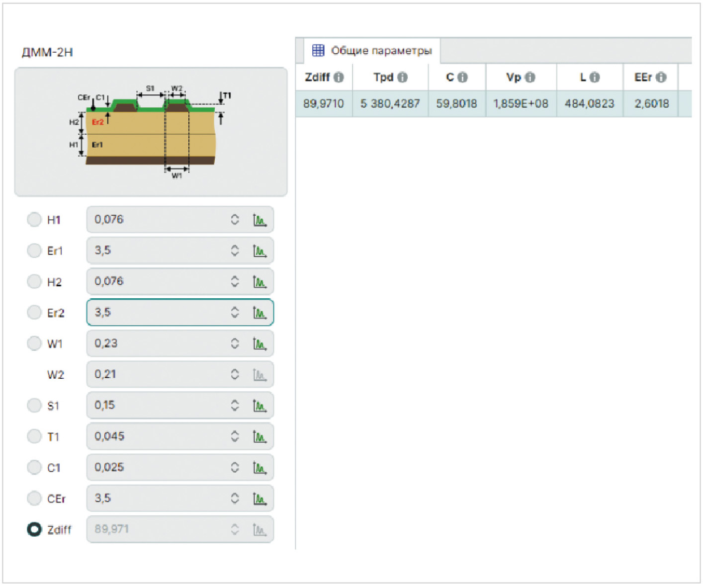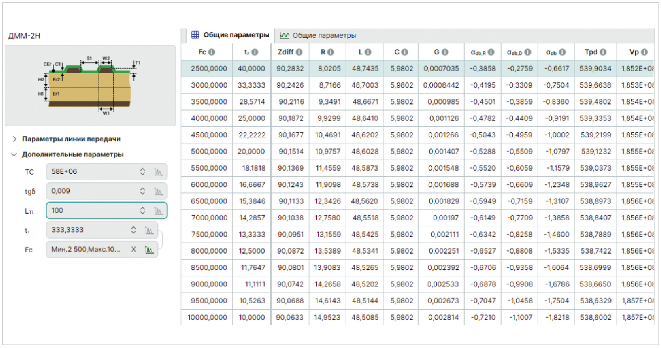 Выполним расчёт параметров дифференциальной пары, представленной выше (рис. 3), в частотном диапазоне от 2,5 ГГц до 10 ГГц с шагом 500 МГц в программе SimPCB Lite. Результат расчёта показан на рис. 5 и соответствует длине линии в 100 мм.