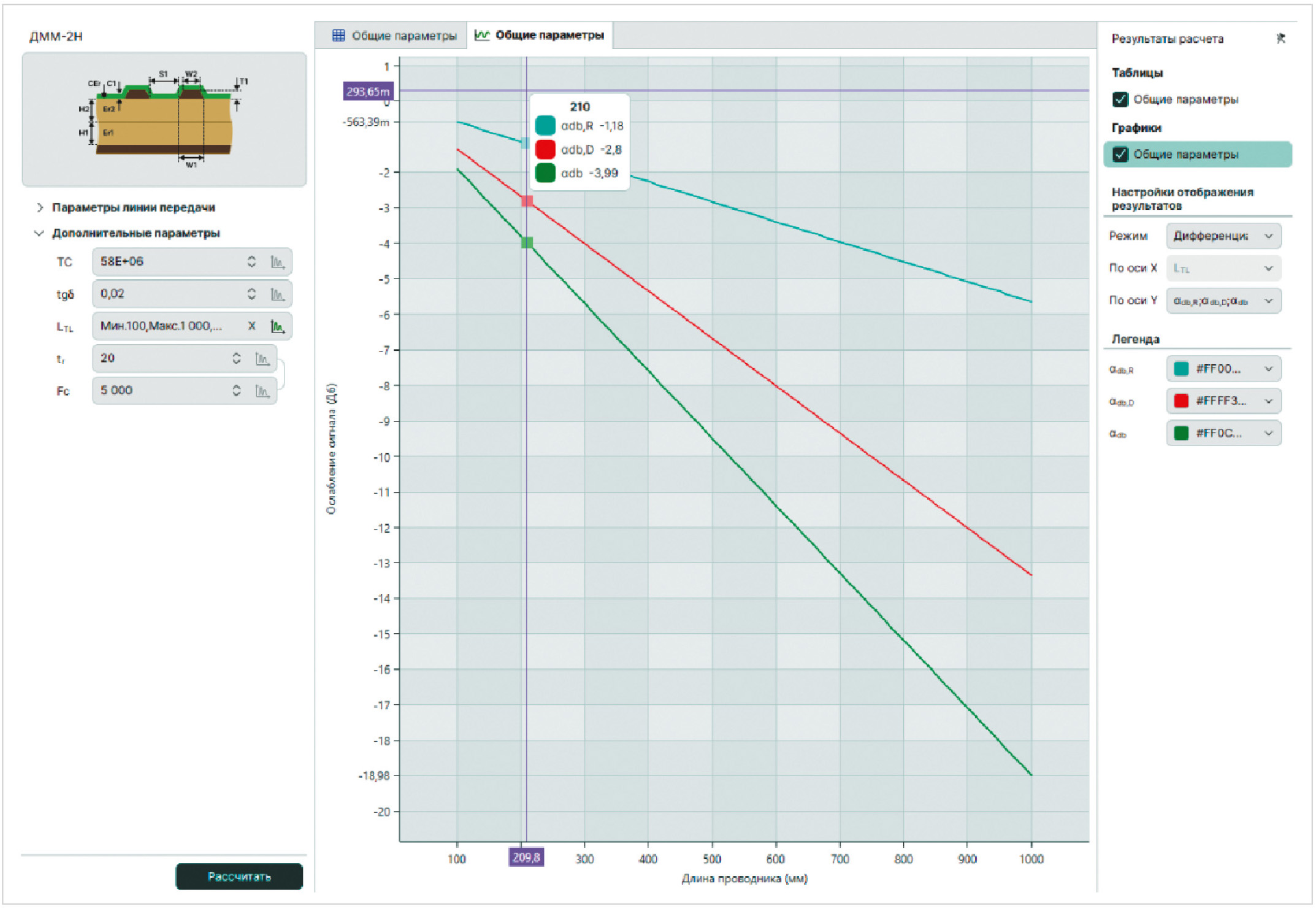 В первом примере используется материал TU-872. Данный материал рекомендуется применять в высокоскоростных устройствах. Однако инженер часто ориентируется на стандартный FR4. Отличия этих двух материалов в диэлектрической проницаемости и тангенсе угла диэлектрических потерь. Для второго материала первый параметр составляет 4,2, а второй – 0,02. Следует отметить, что тангенс угла диэлектрических потерь в значительной степени влияет на ослабление сигнала в диэлектрике. Выполним расчёт, аналогичный представленному выше, но для материала FR4, и оценим максимальную длину линии. Результат расчёта показан на рис. 8. Для материала FR4 максимальная длина линии будет меньше и составит 210 мм.