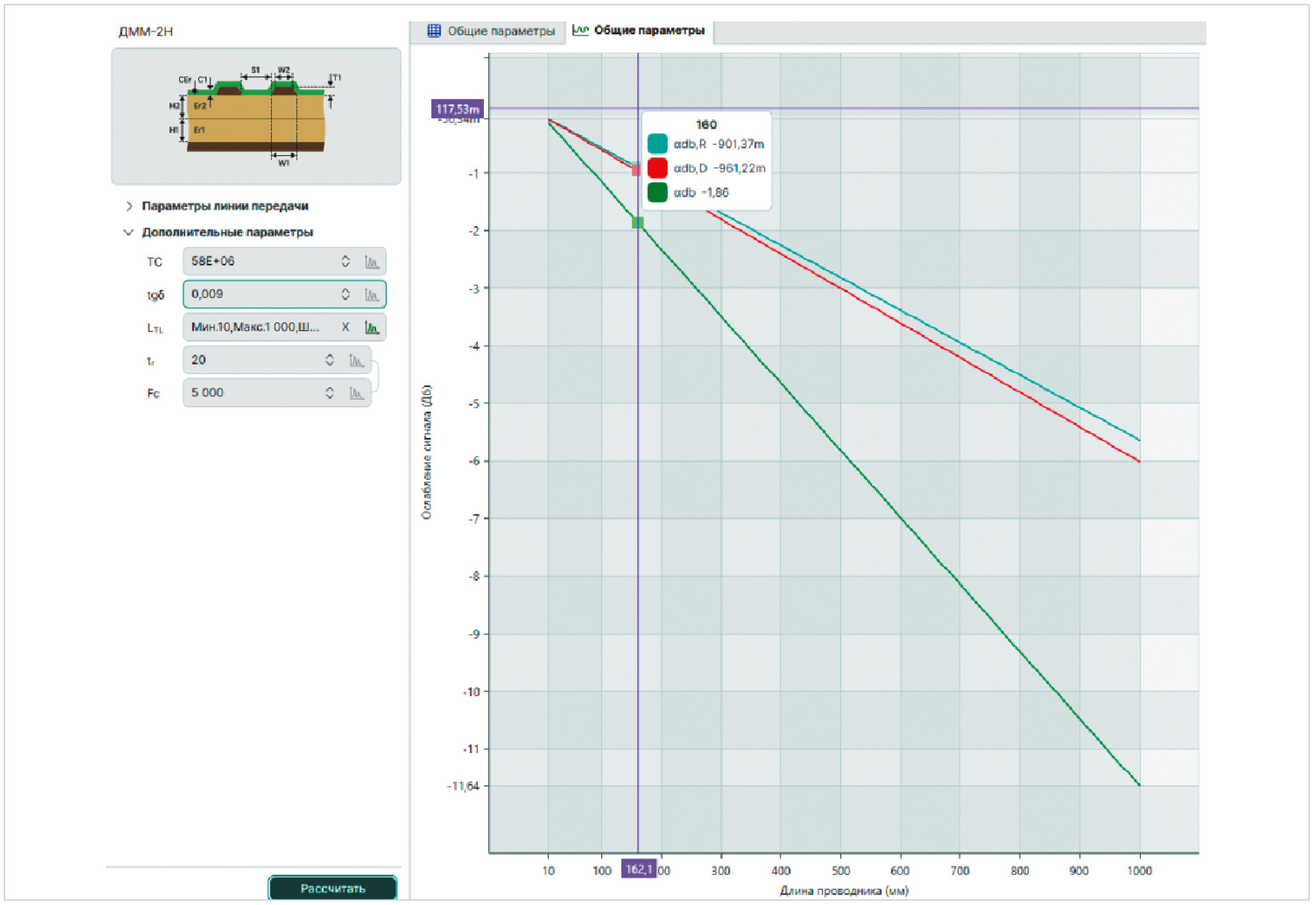На рис. 7 представлен результат расчёта. Видно, что ослабление сигнала в –4 дБ соответствует длине линии в 368 мм.