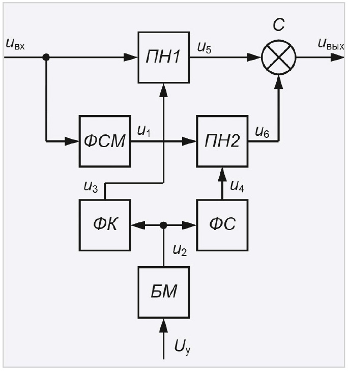 Выходные напряжения u5 и u6, полученные после перемножителей ПН1 и ПН2, суммируются в сумматоре С, на выходе которого и на выходе УФВ формируется напряжение uвых [7]: