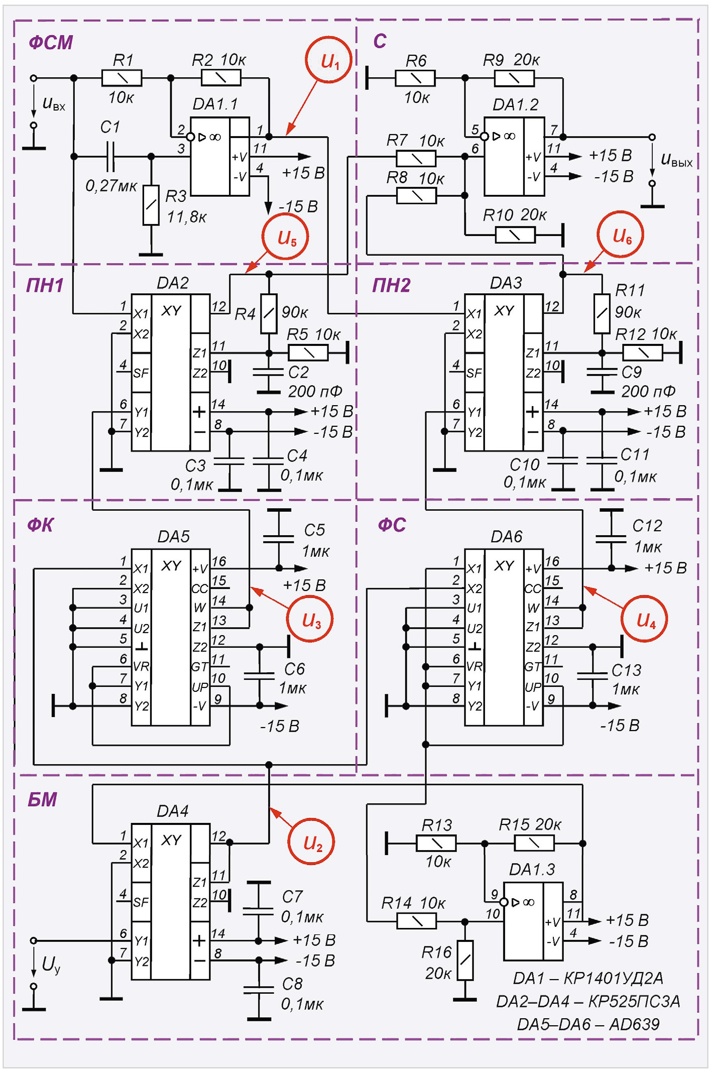 Принципиальная схема разработанного УФВ приведена на рис. 2. Схема выполнена на интегральных микросхемах (ИМС): счетверённом ОУ DA1 типа КР1401УД2А, перемножителях напряжений DA2…DA4 типа КР525ПС3А и конверторов тригонометрических функций DA5, DA6 типа AD639 [8].