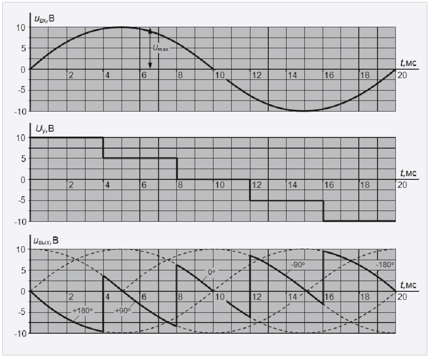 Из осциллограмм видно, что на первом интервале входного напряжения uвх от 0 до 4 мс при напряжении управления Uу = +10 В угол сдвига фазы сигнала составляет φ = +180°. На втором интервале входного напряжения uвх от 4 до 8 мс при напряжении управления Uу = + 5 В угол сдвига фазы сигнала составляет φ = +90°. На третьем интервале входного напряжения uвх от 8 до 12 мс при напряжении управления Uу = 0 В угол сдвига фазы сигнала составляет φ = 0°. На четвёртом интервале входного напряжения uвх от 12 до 16 мс при напряжении управления Uу = –5 В угол сдвига фазы сигнала составляет φ = –90°. На пятом интервале входного напряжения uвх от 12 до 16 мс при напряжении управления Uу = –5 В угол сдвига фазы сигнала составляет φ = –180°.
