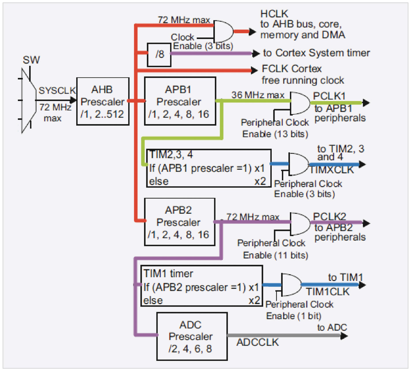 После делителя AHB Prescaler тактовый сигнал распределяется между шинами микроконтроллера. Сигнал HCLK поступает в процессорное ядро, память и периферию шины AHB. FCLK также идёт в ядро. Делитель APB1 Prescaler формирует сигнал тактирования устройств шины APB1, а APB2 Prescaler – для устройств шины APB2.