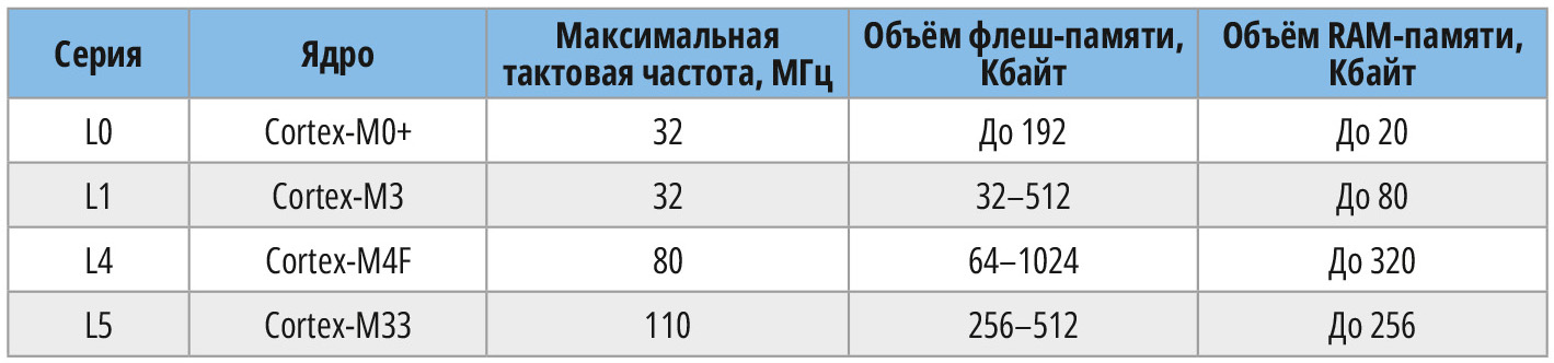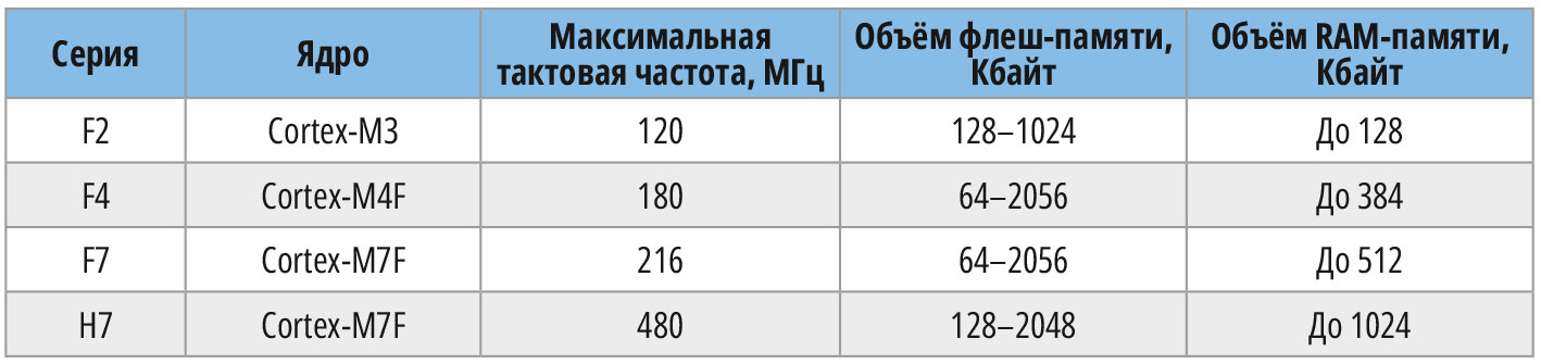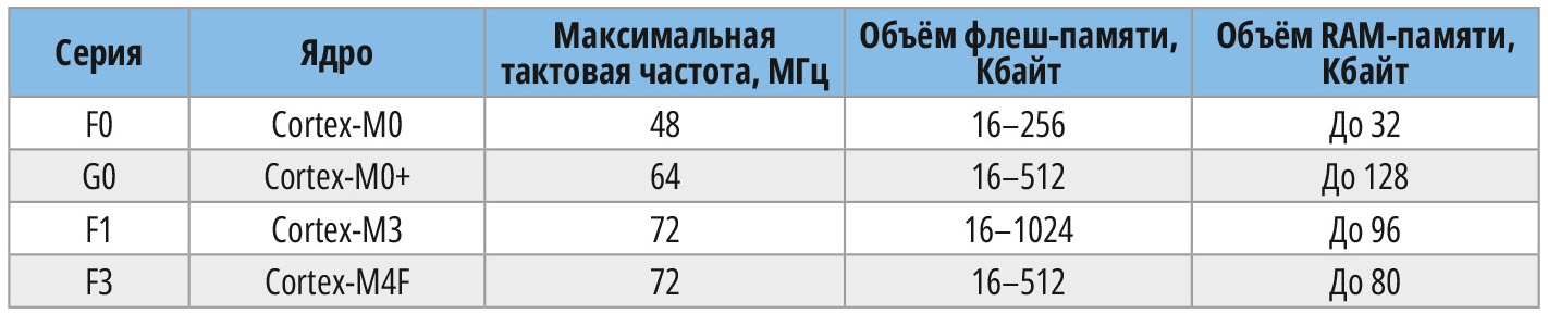 Высокопроизводительные микроконтроллеры STM32 предназначены для реализации приложений для управления высокотехнологичным оборудованием, и некритичных к энергопотреблению. Этот ряд представлен в табл. 1.