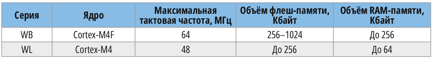 Беспроводные микроконтроллеры STM32 находят применение в беспроводных приложениях, критичных к габаритам, например, в беспроводных сенсорных сетях Bluetooth LE, Zigbee, Thread. Представлены в табл. 4.