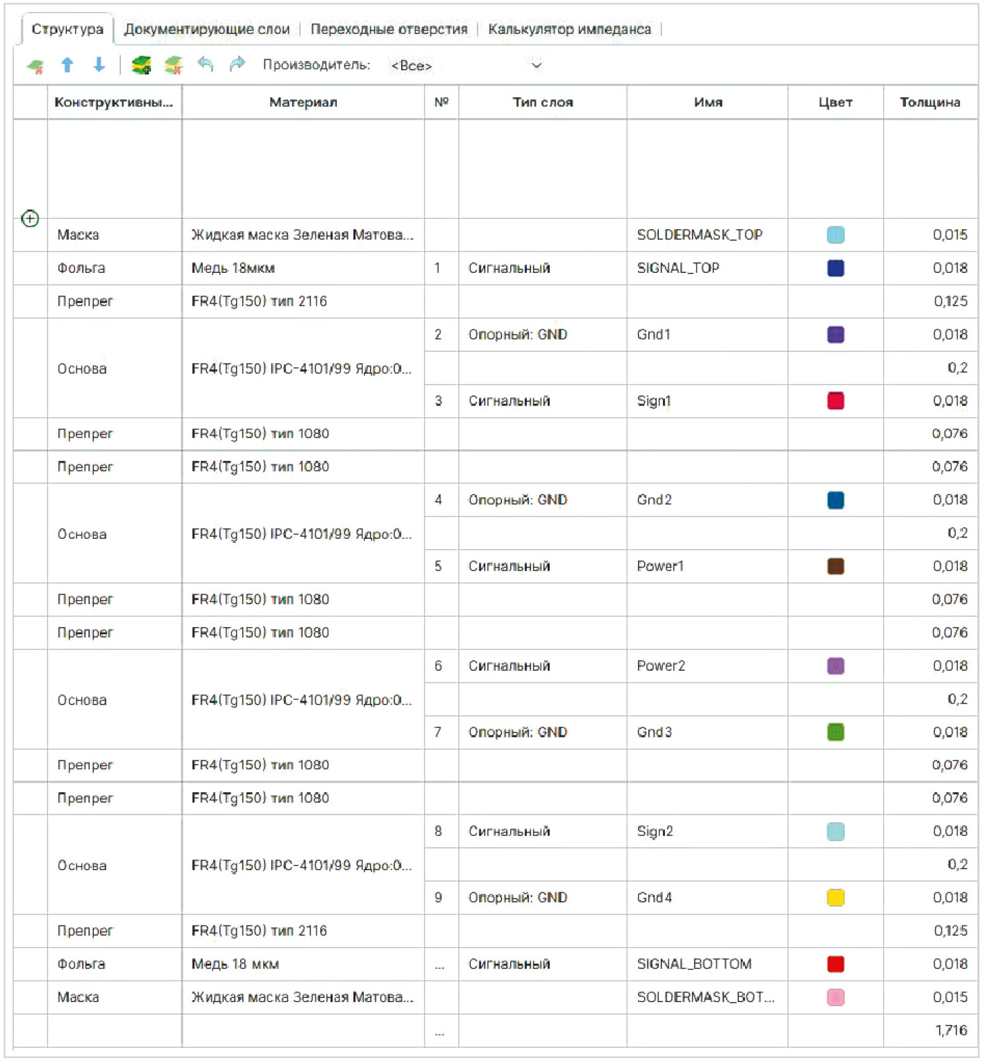 - Все расчёты учитывают стек и опорные слои из конфигуратора слоёв.