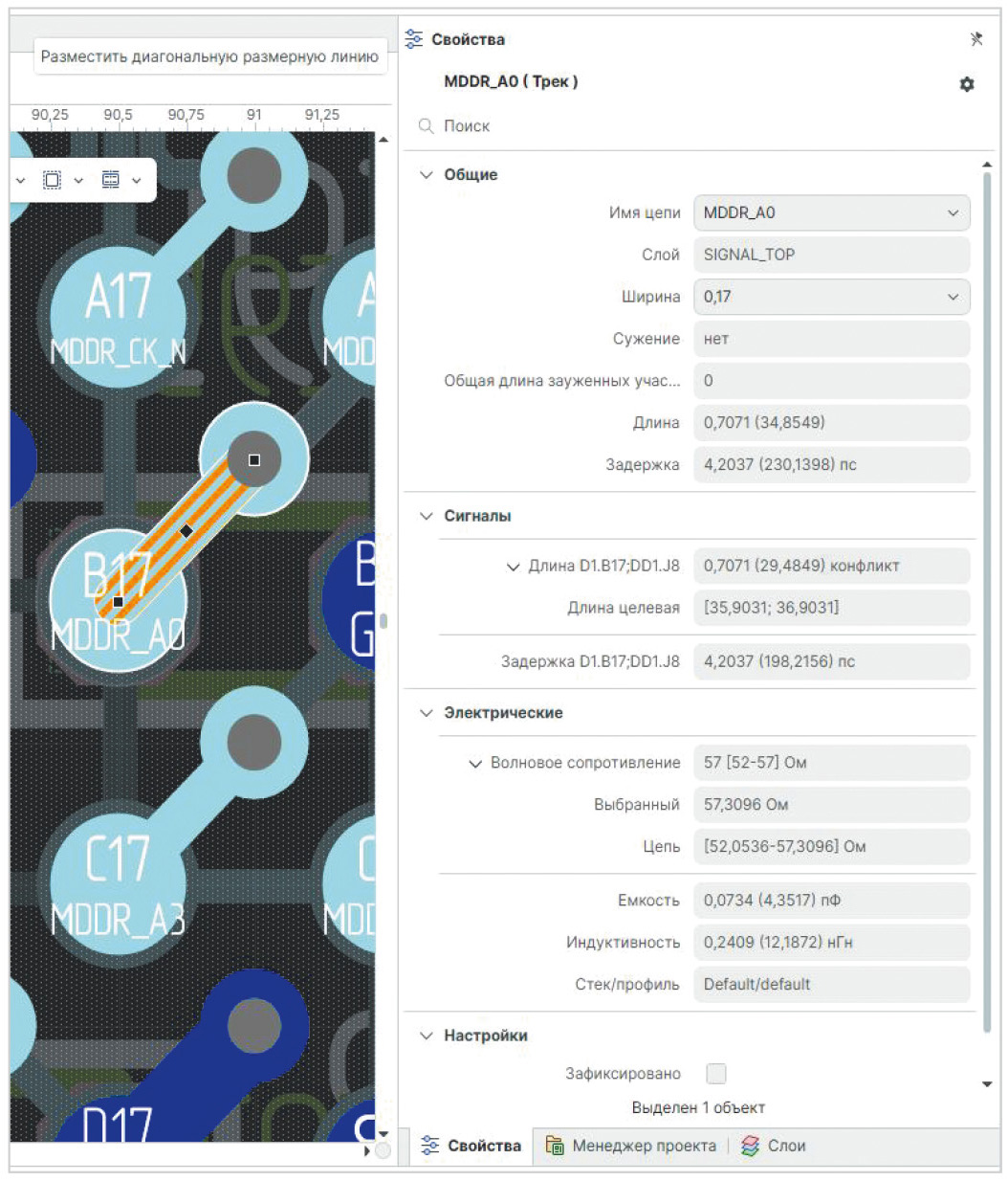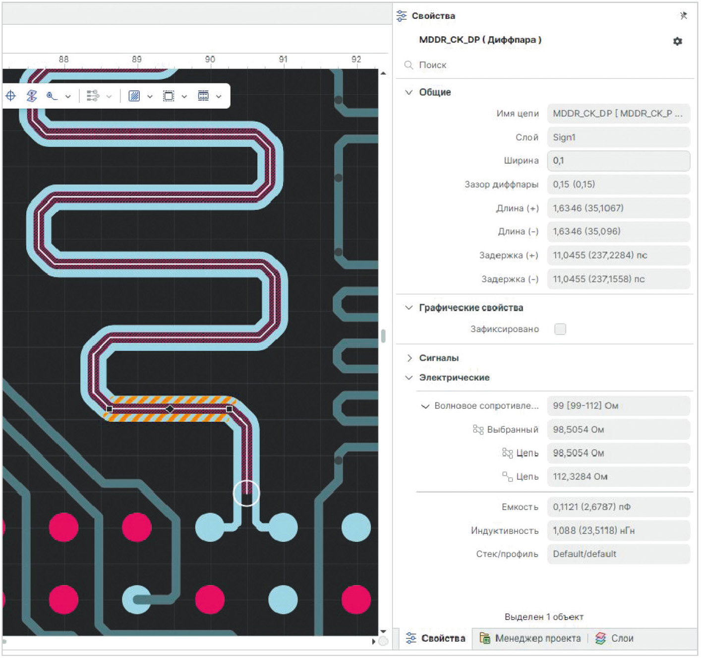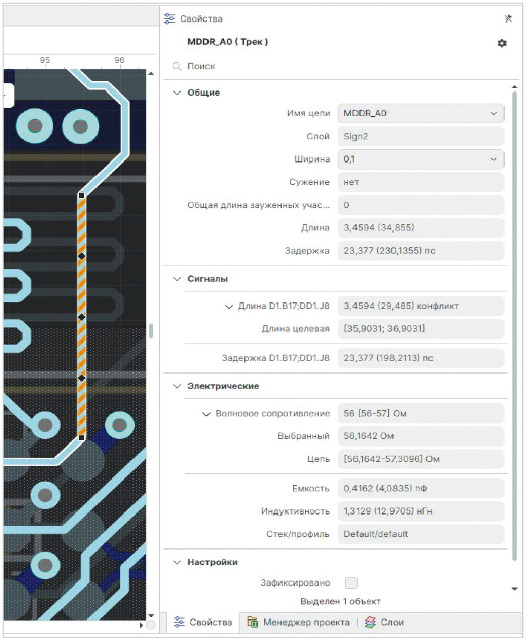 При выборе трека (дифф. пары) в редакторе платы в панели свойств автоматически отображаются и рассчитываются параметры: