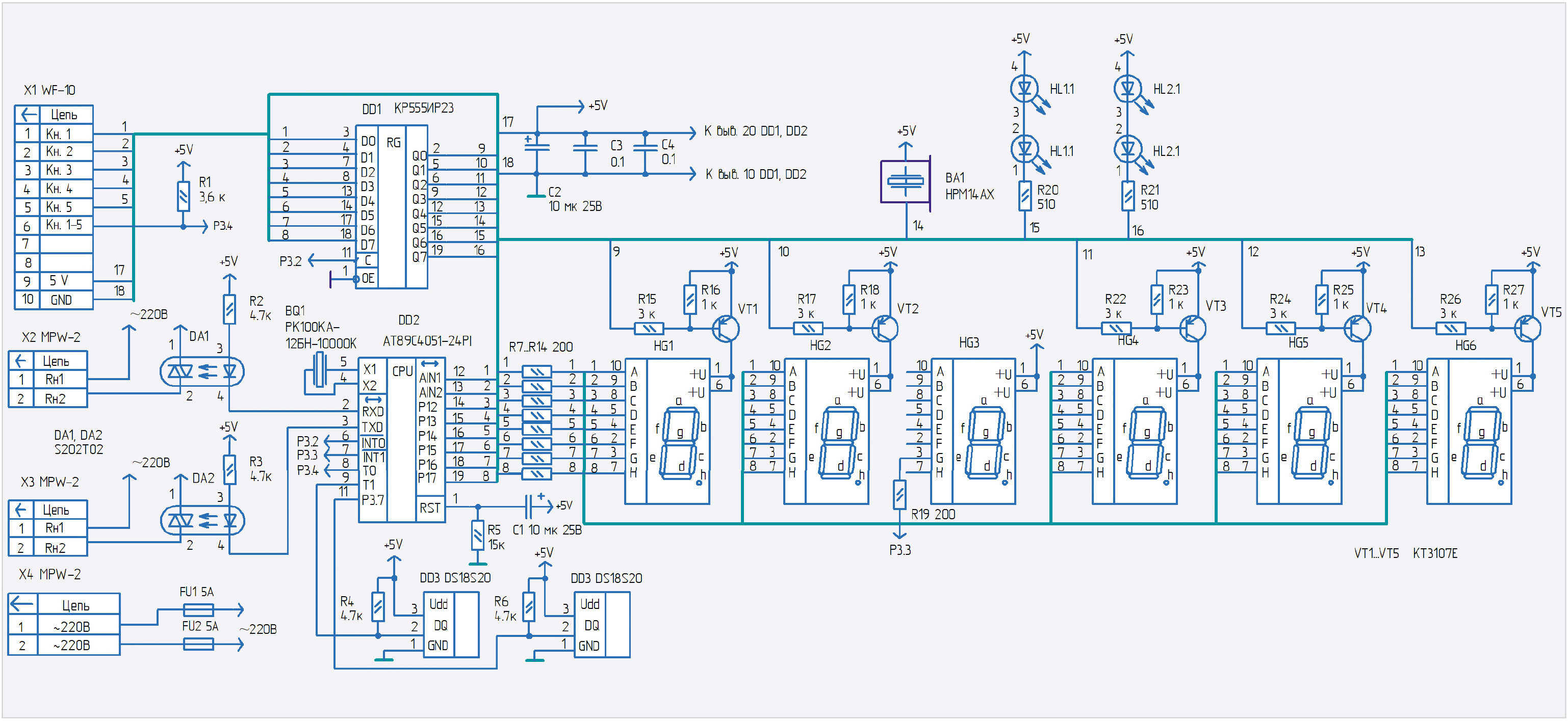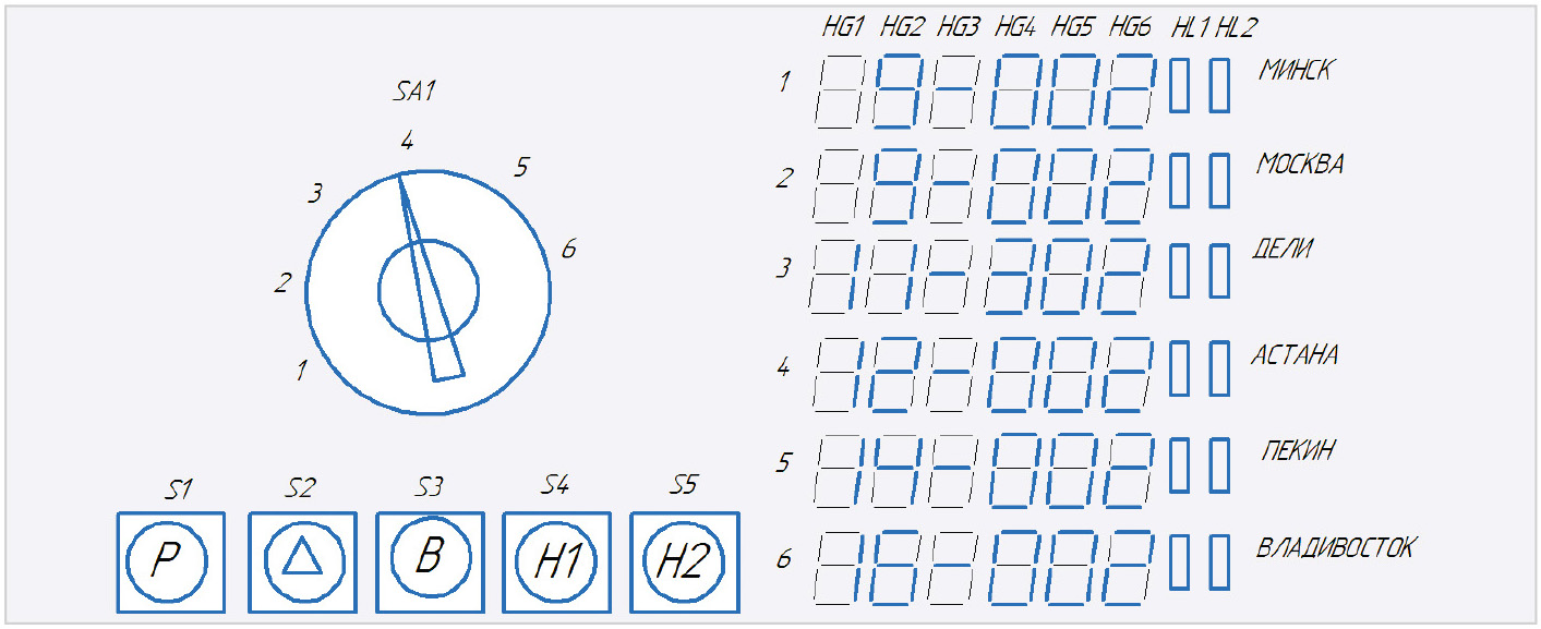 Позиционные обозначения элементов интерфейса: SA1, S1…S5, HG1…HG6, HL1, HL2 на рис. 3 приведены условно. Они показаны для понимания работы устройства в целом и совпадают с позиционными обозначениями, приведёнными на рис. 1 и 2. Цифровое табло устройства содержит шесть строк. Каждая строка содержит шесть семисегментных индикаторов и две световые полосы. Элементы строки № 1 (HG1…HG6 и световые полосы HL1, HL2) (маркировка строки – МИНСК) установлены на часах № 1. Элементы строки № 2 (маркировка МОСКВА) установлены на часах № 2 и т.д. Соединитель Х1 часов № 1 подключается к соединителю Х2 платы клавиатуры (рис. 2). Соединитель Х1 часов № 2 подключается к соединителю Х3 платы клавиатуры и т.д. Соответственно, соединитель Х1 часов № 6 подключается к соединителю Х7 платы клавиатуры.