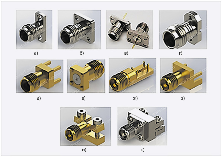 Компания Hualink выпускает 14 типов приборных соединителей 2.4 mm: 4 фланцевых панельных составных соединителя для подключения СВЧ-ввода с центральным проводником диаметром 0,3 мм; 6 концевых розеток разной конструкции (рис. 2и, рис. 2к); 1 розетка для поверхностного монтажа на печатную плату; 2 концевые розетки для монтажа в отверстия печатной платы с центральными контактами диаметрами 0,18 мм и 0,23 мм; 1 фланцевый соединитель для вертикальной установки на печатную плату без пайки.