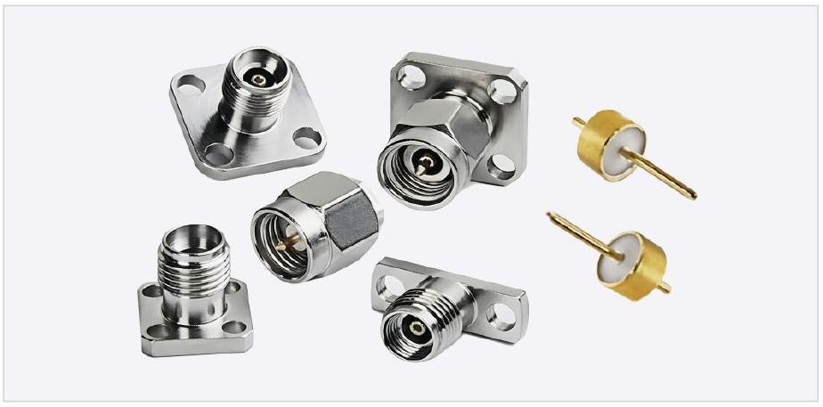Соединители с фланцами с двумя или четырьмя крепёжными отверстиями и вводы СВЧ показаны на рис. 8 [7].