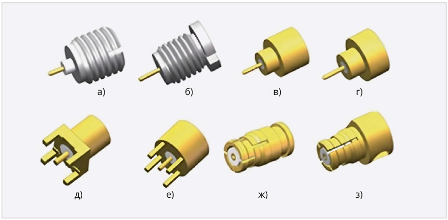 В группу приборных соединителей компания Hualink включила коаксиально-микрополосковые переходы, соединители для установки в отверстия печатной платы и поверхностного монтажа, концевые и вертикальные соединители. Внешний вид приборных соединителей показан на рис. 2.
