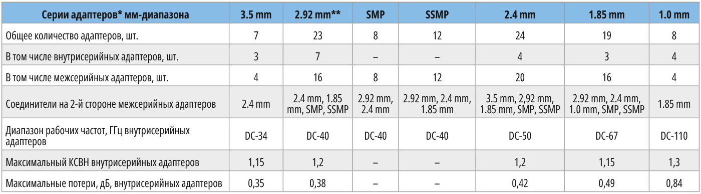 В состав межсерийных адаптеров этой компании (24 типа) включены следующие серии: 1.85 mm – 1.0 mm (4), 2.4 mm – 1.0 mm (4), 2.4 mm – 1.85 mm (4), 1.85 mm – SSMP, 2.92 mm – 2.4 mm (4), 2.4 mm – SSMP (4), 2.92 mm – SMP (4) и 3.5 mm – SMP (4) [13].