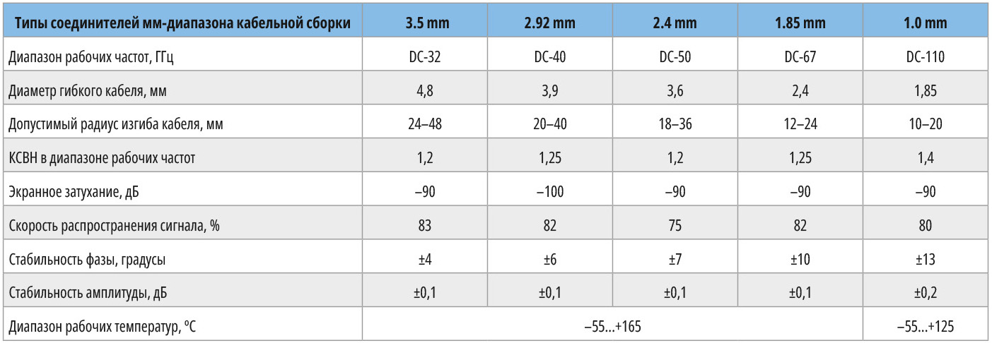 Компания Mechanc разработала серию гибких кабельных сборок (20) с низкими потерями и стабильной фазой (500 ppm во всём температурном диапазоне) для применения в радарах с фазированной антенной решёткой и в системах микроволновой связи. Сборки мм-диапазона предназначены для работы в диапазоне частот 32–110 ГГц [16]. Разработаны около 40 типов сборок с соединителями (вилка и розетка) 3.5 mm, 2.92 mm, 2.4 mm и 1.85 mm. Кабельные сборки компании Mechanc применяют для установки в системы связи, в модулях спутниковых систем, в оборудовании для управления и контроля, а также в радарах. В табл. 4 представлены параметры сборок с одинаковыми соединителями вилка – розетка на обеих сторонах [18].